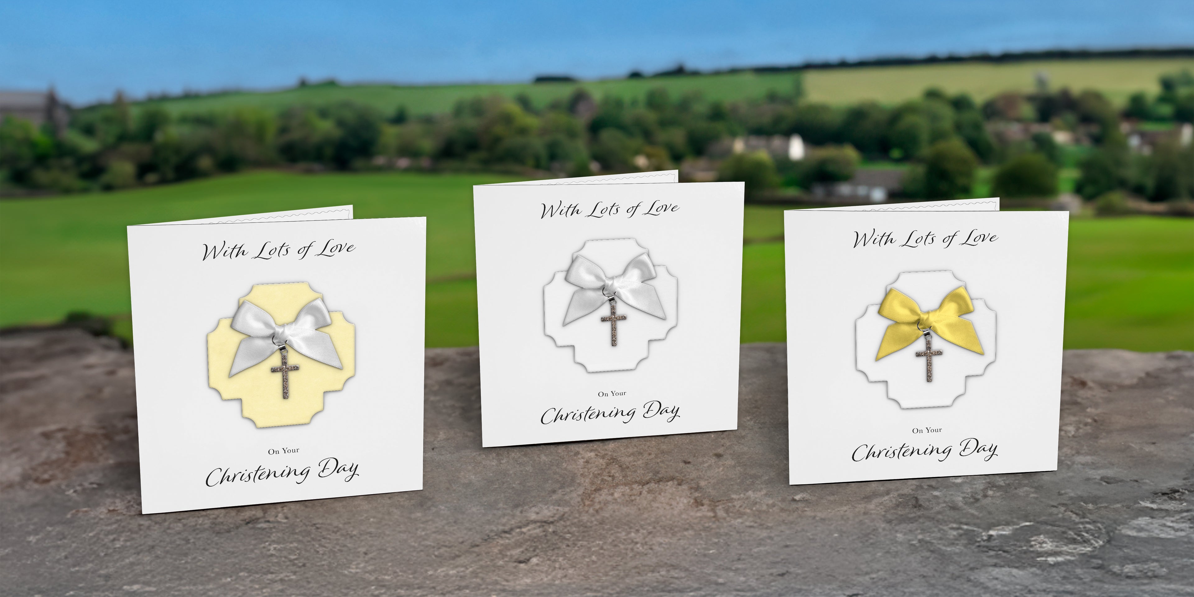Christening Card (Diamante Cross Charm & Bow) - White Cross & Yellow Bow