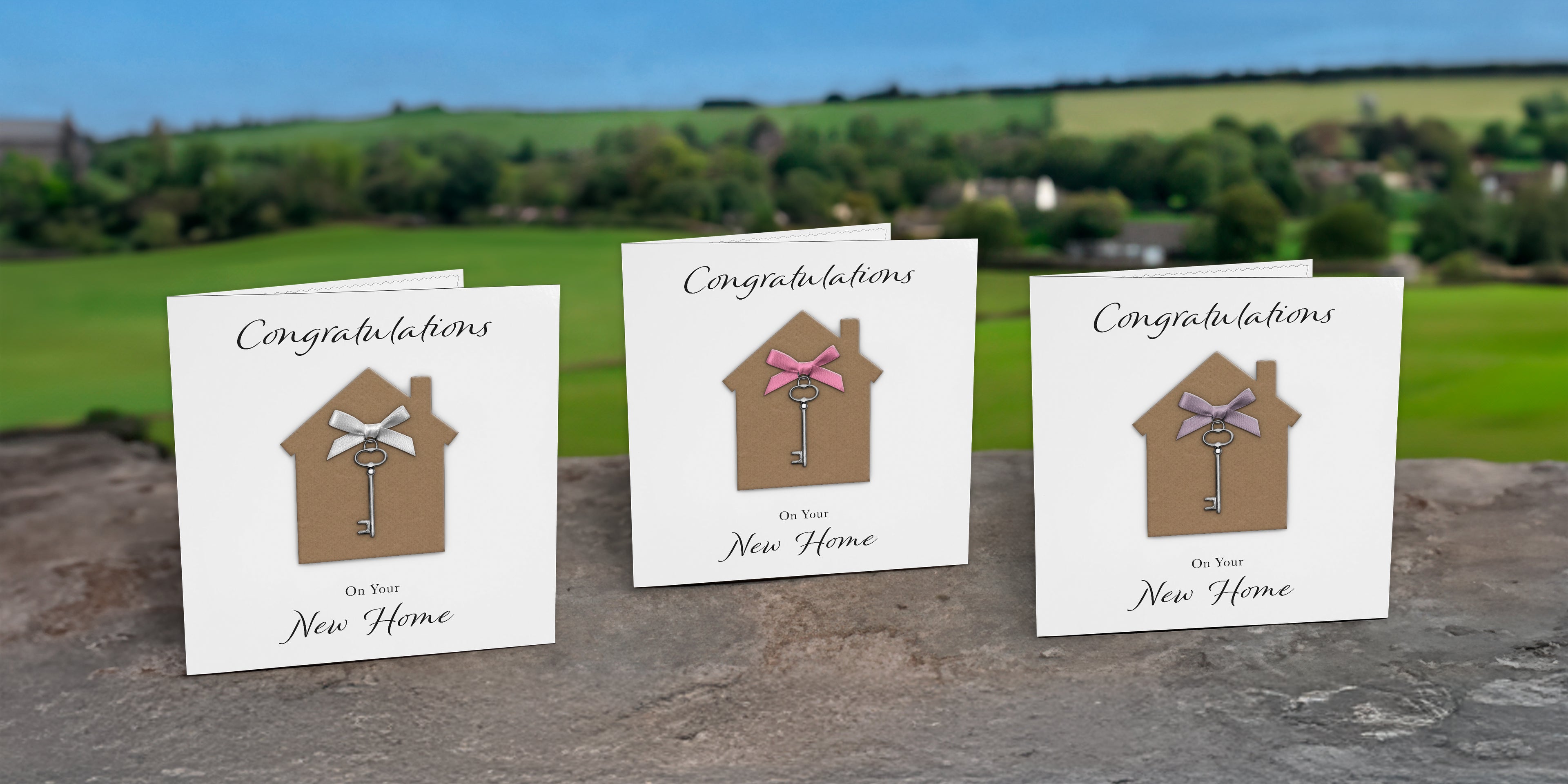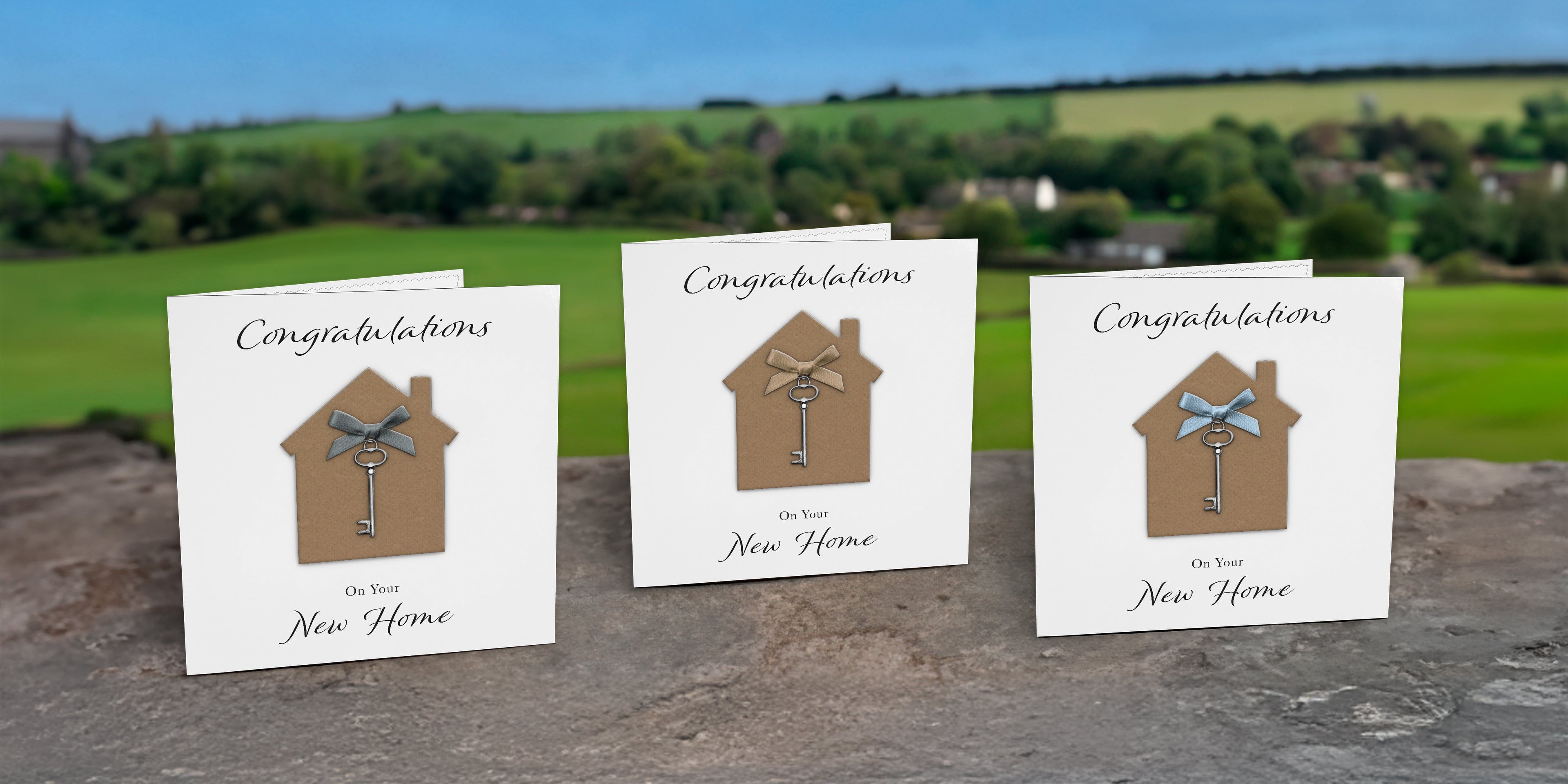New Home Card (Key Charm & Bow) - White Cardstock - Grey Bow