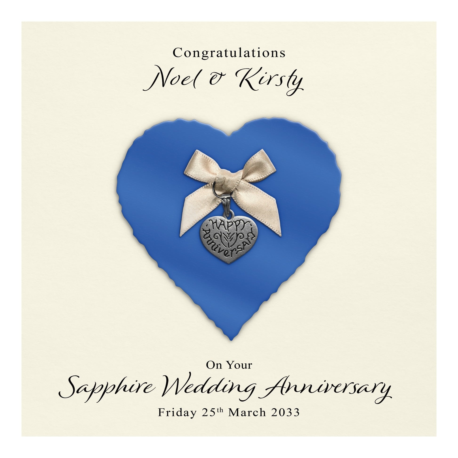 The design features a Raised Heart Shape Cardstock Panel in a carefully chosen colour and texture, finished with a Hand-tied bow and a High-Quality Metal Charm. Your Personalised Text will be printed on the front design, an Ivory Paper Insert then adds to the premium feel and leaves space for the option of either a Personalised Printed Message Inside or alternatively leave it Blank for a sentimental handwritten message.