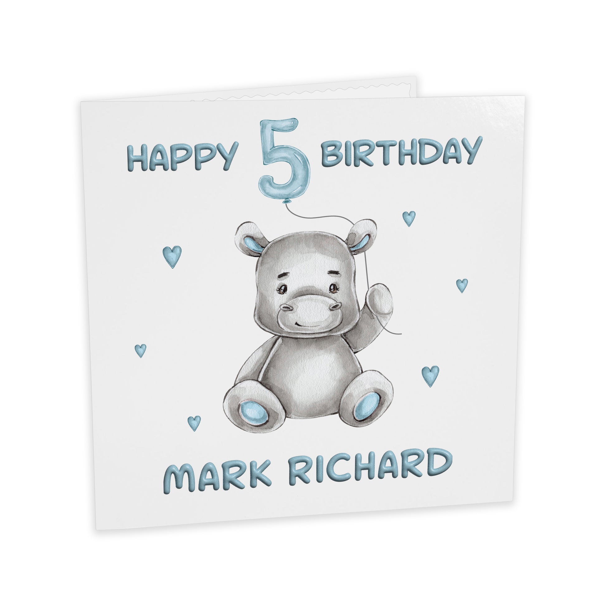 Personalised Birthday Card Balloon Animals (Hippo) - Blue
