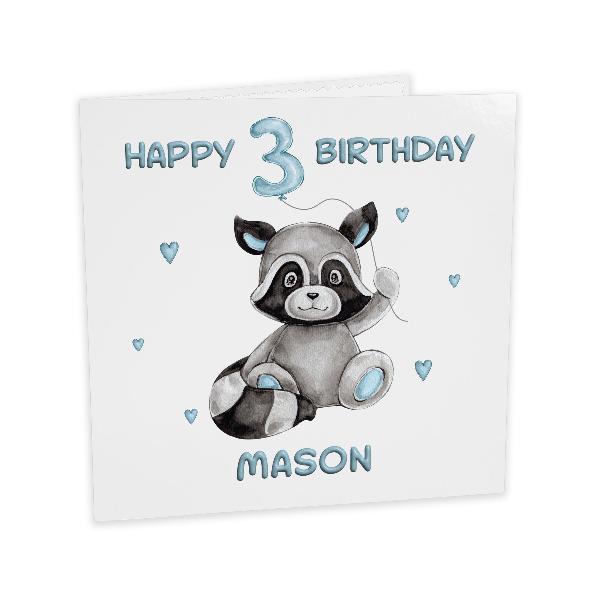 Personalised Birthday Card Balloon Animals (Raccoon) - Blue