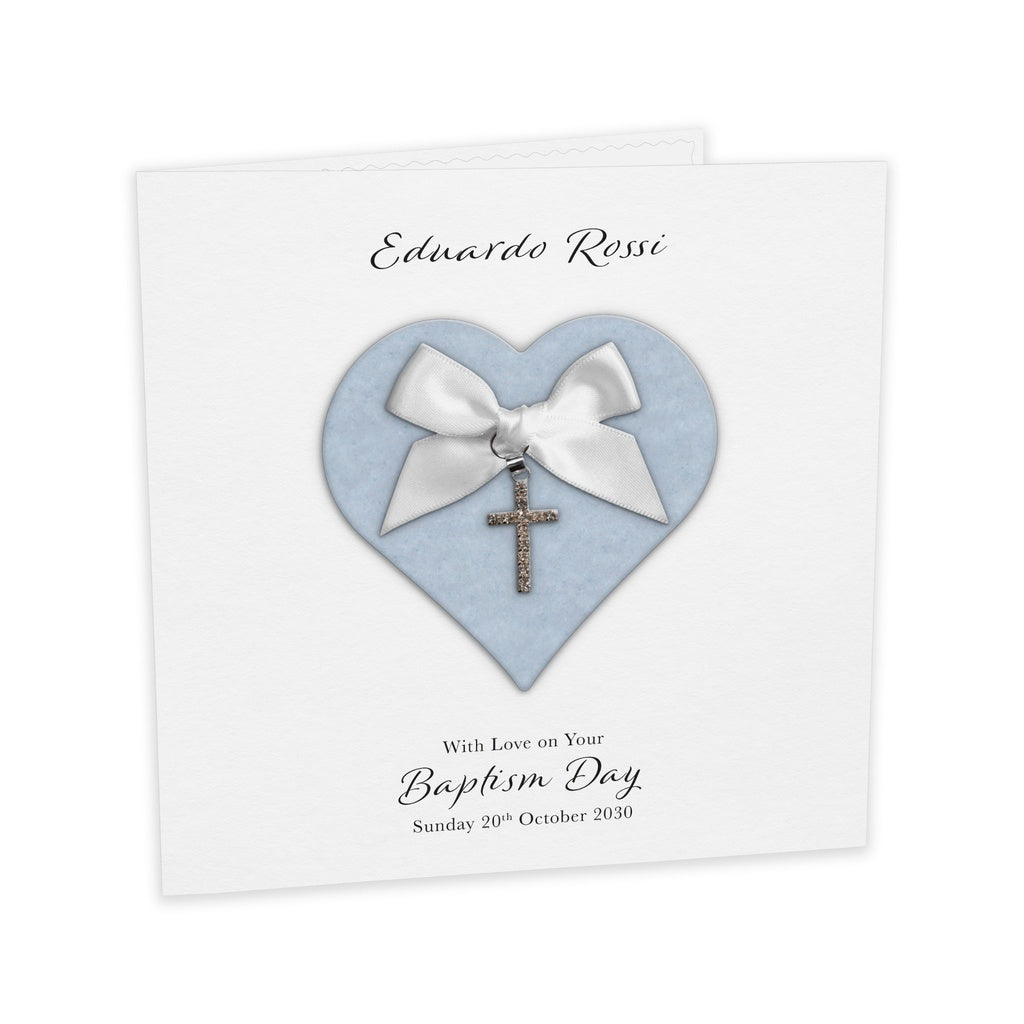 The design features a Raised Heart Shape Cardstock Panel in a carefully chosen Blue colour and texture, finished with a Hand-tied bow and a High-Quality Metal & Diamante Cross Charm. Your Personalised Text will be printed on the front design, a White Paper Insert then adds to the premium feel and leaves space for the option of either a Personalised Printed Message Inside or alternatively left Blank for a more sentimental handwritten message.