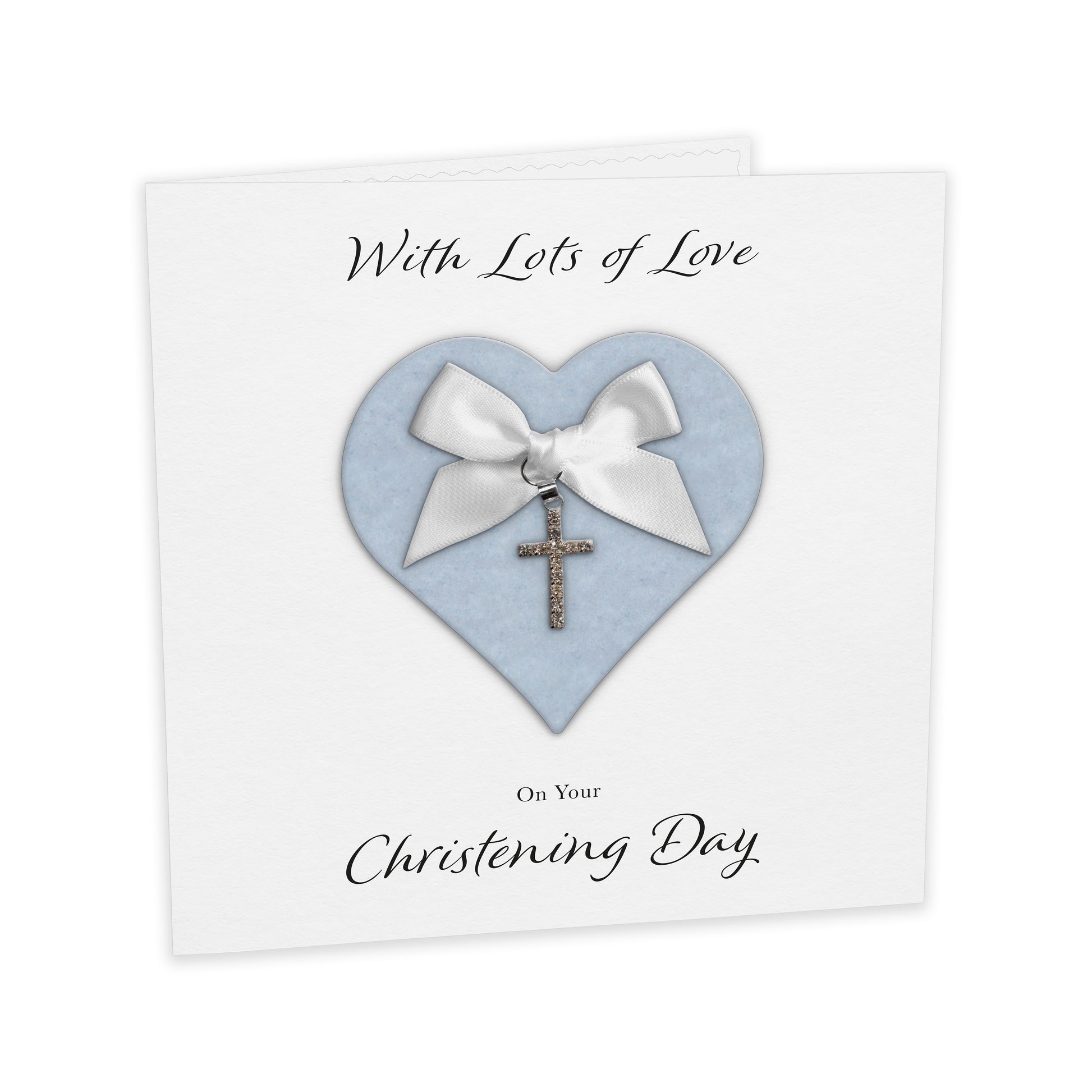 Christening Card (Diamante Cross Charm & Bow) - Blue Heart & White Bow