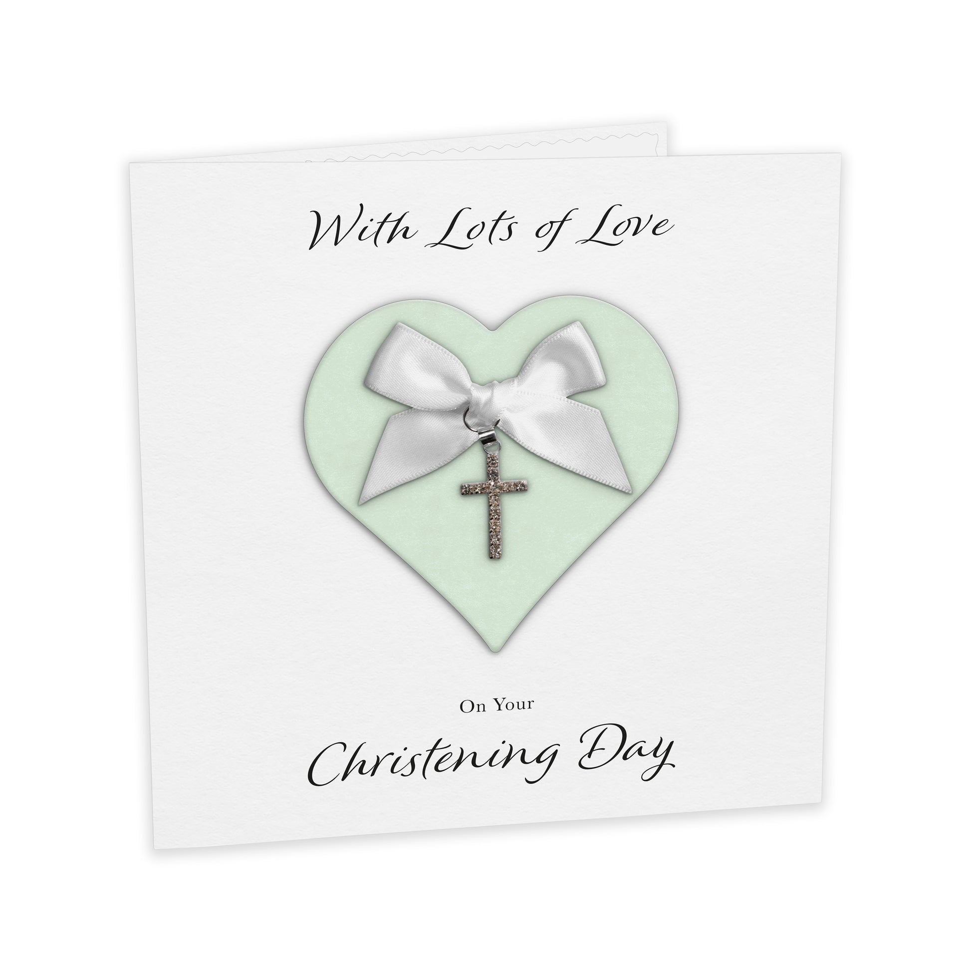 Christening Card (Diamante Cross Charm & Bow) - Green Heart & White Bow