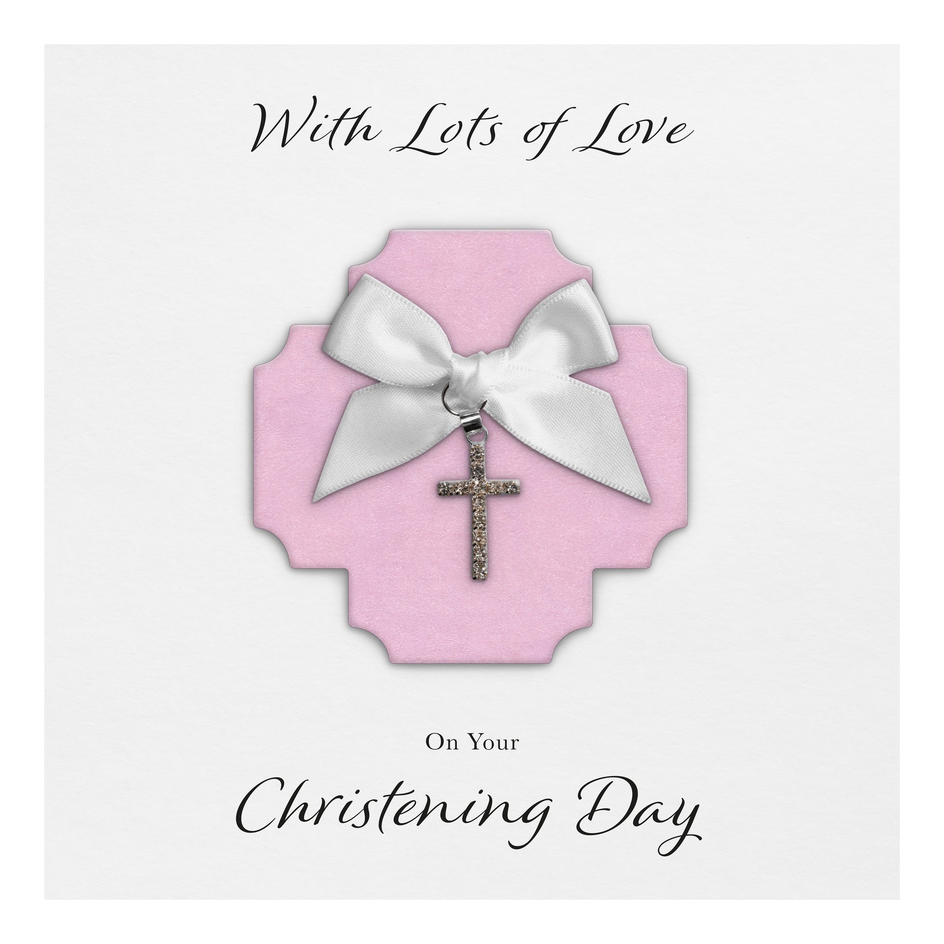 Christening Card (Diamante Cross Charm & Bow) - Pink Cross & White Bow