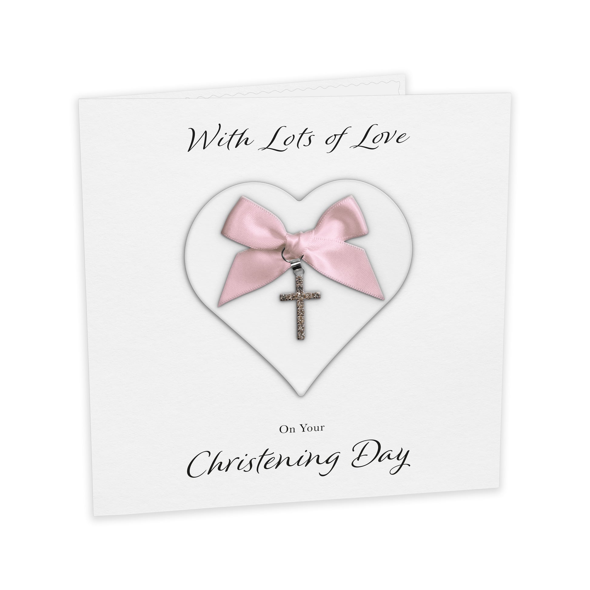 Christening Card (Diamante Cross Charm & Bow) - White Heart & Pink Bow