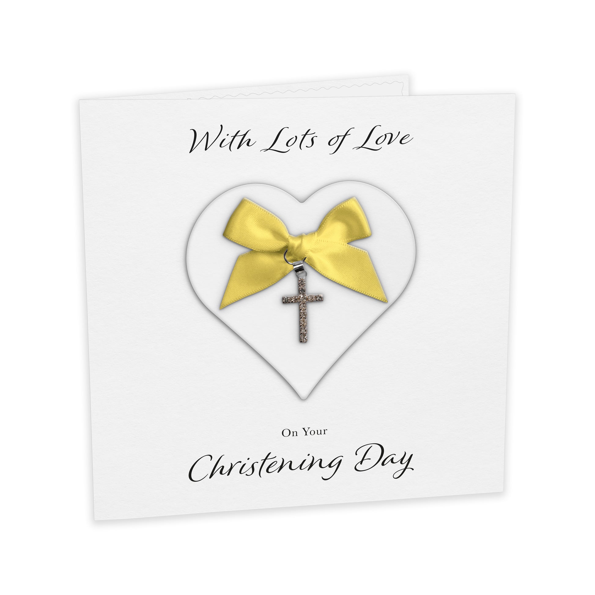 Christening Card (Diamante Cross Charm & Bow) - White Heart & Yellow Bow