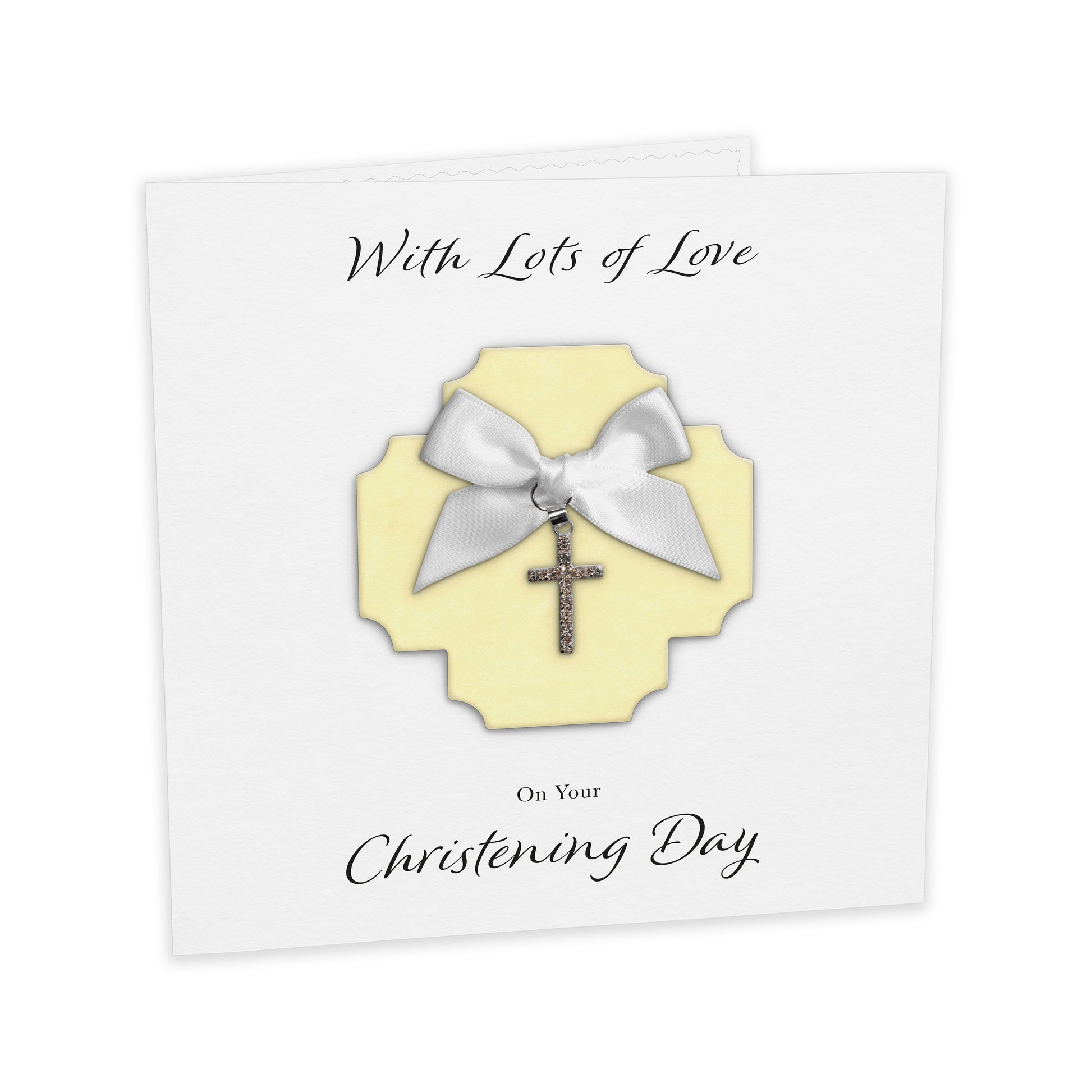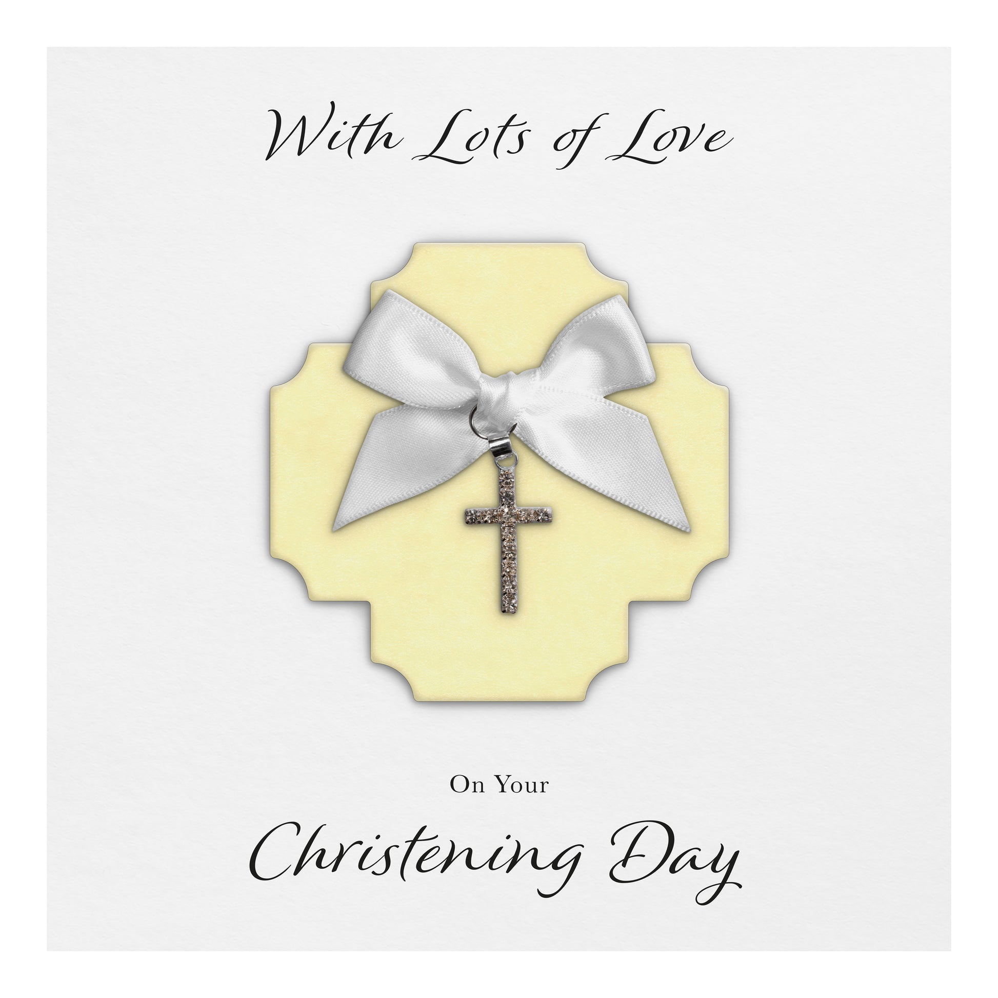 Christening Card (Diamante Cross Charm & Bow) - Yellow Cross & White Bow