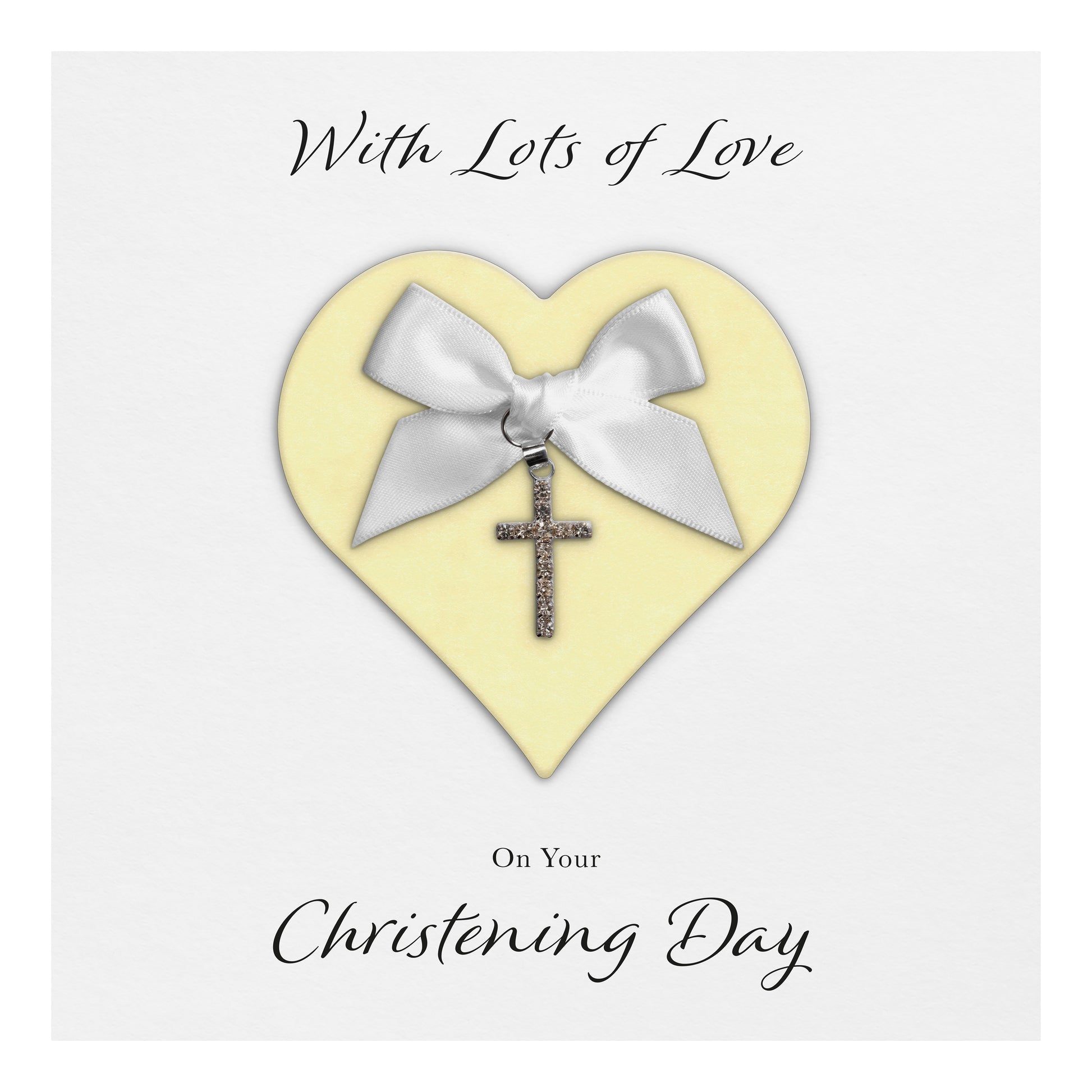 Christening Card (Diamante Cross Charm & Bow) - Yellow Heart & White Bow