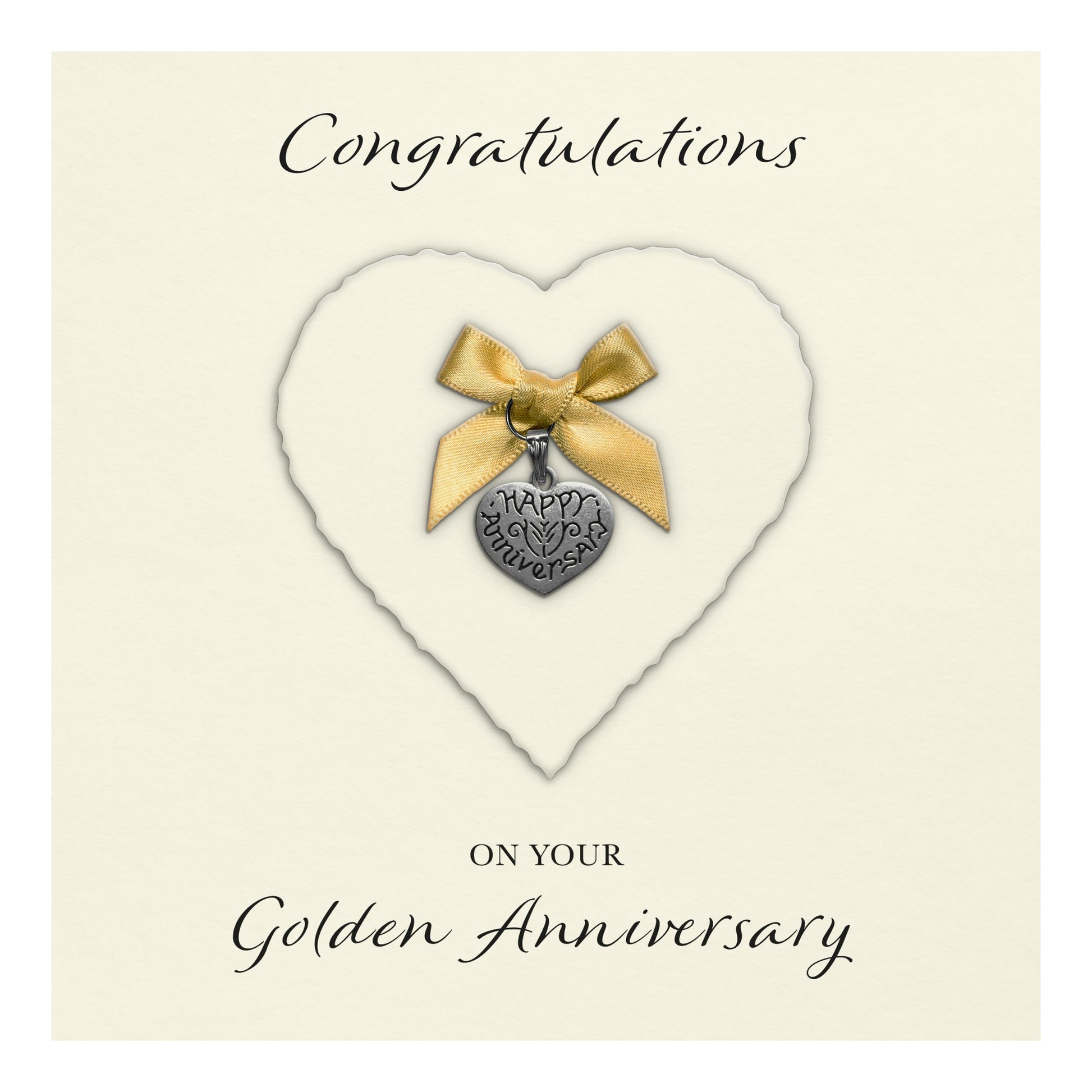 Golden 50th Anniversary Card (Heart Charm & Bow) - Ivory Cardstock