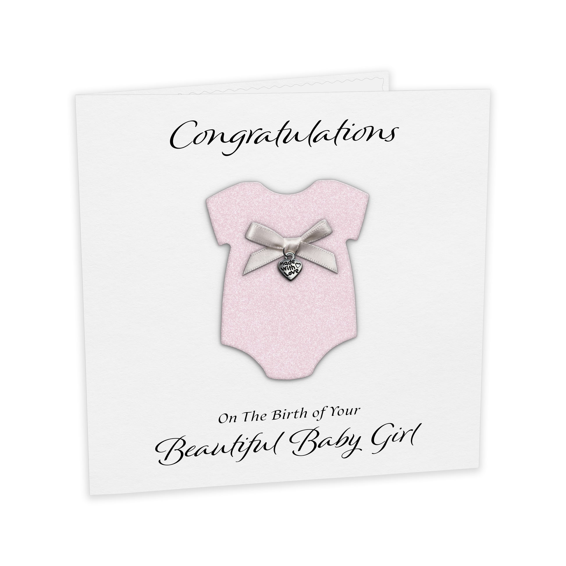 The design features a Raised Baby Grow Shape Cardstock Panel in carefully chosen colours and textures, finished with a Hand-tied bow and a High-Quality Metal Charm. Inside, a Blank Paper Insert adds to the premium feel and leaves space for a sentimental handwritten message.