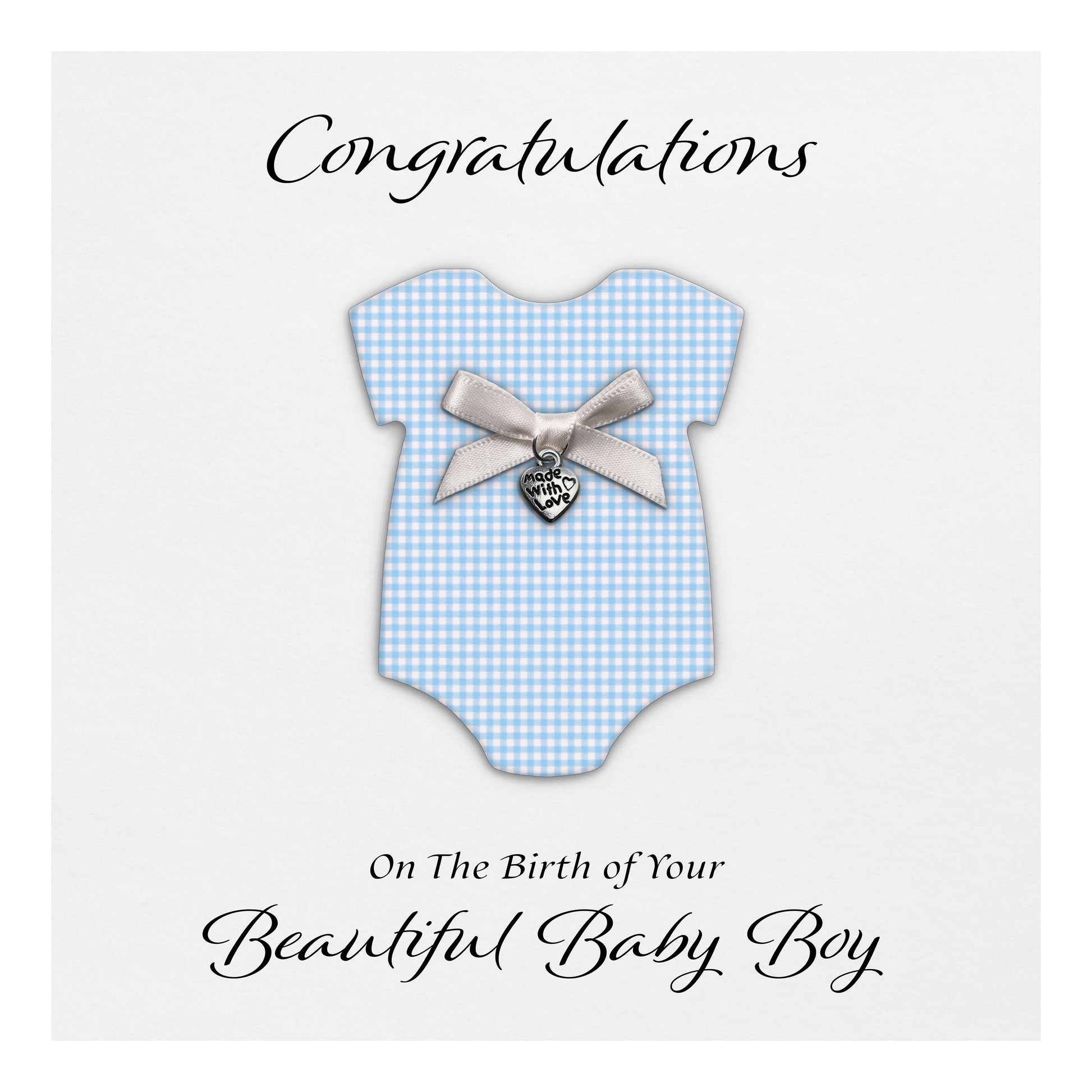 The design features a Raised Baby Grow Shape Cardstock Panel in carefully chosen colours and textures, finished with a Hand-tied bow and a High-Quality Metal Charm. Inside, a Blank Paper Insert adds to the premium feel and leaves space for a sentimental handwritten message.
