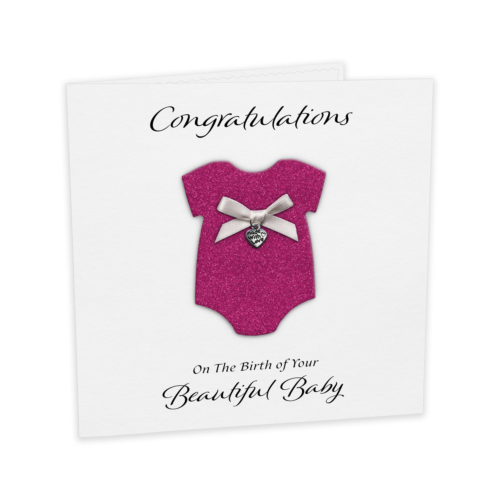 The design features a Raised Baby Grow Shape Cardstock Panel in carefully chosen colours and textures, finished with a Hand-tied bow and a High-Quality Metal Charm. Inside, a Blank Paper Insert adds to the premium feel and leaves space for a sentimental handwritten message.