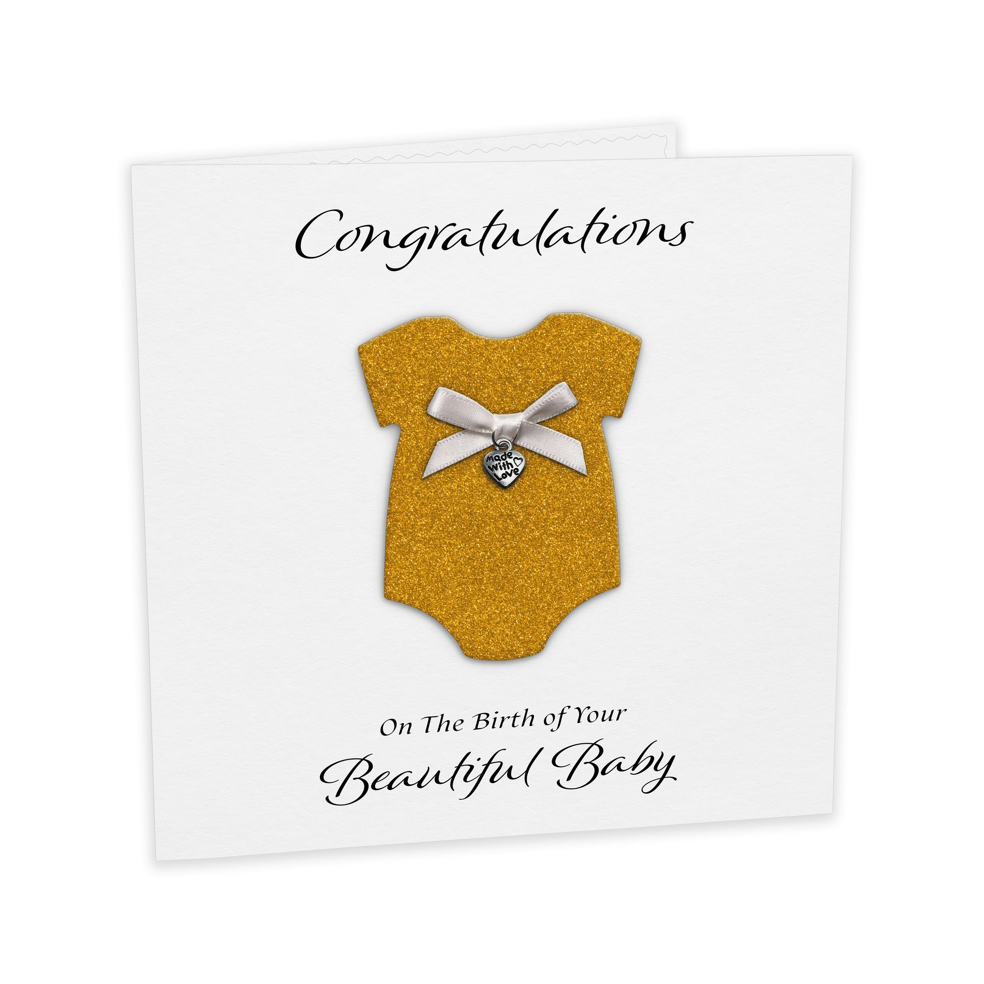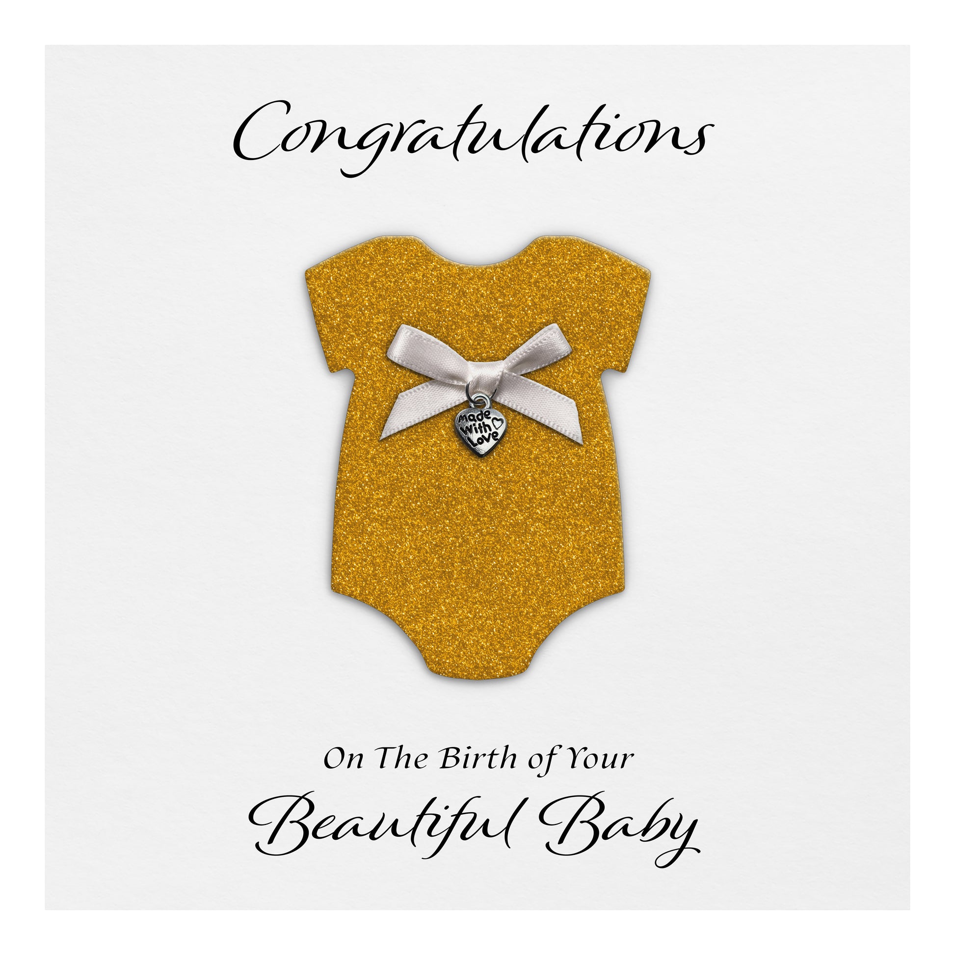 The design features a Raised Baby Grow Shape Cardstock Panel in carefully chosen colours and textures, finished with a Hand-tied bow and a High-Quality Metal Charm. Inside, a Blank Paper Insert adds to the premium feel and leaves space for a sentimental handwritten message.