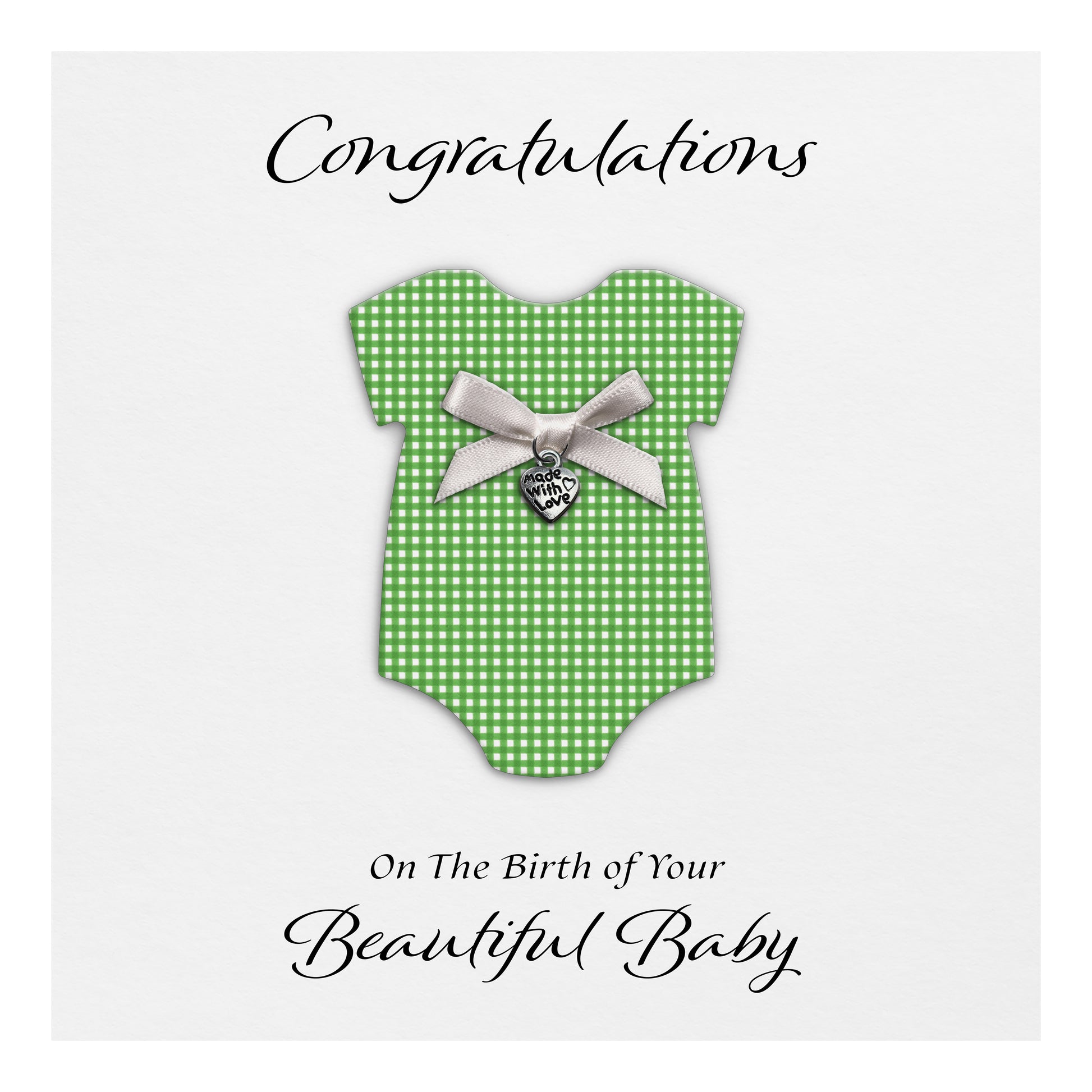 The design features a Raised Baby Grow Shape Cardstock Panel in carefully chosen colours and textures, finished with a Hand-tied bow and a High-Quality Metal Charm. Inside, a Blank Paper Insert adds to the premium feel and leaves space for a sentimental handwritten message.