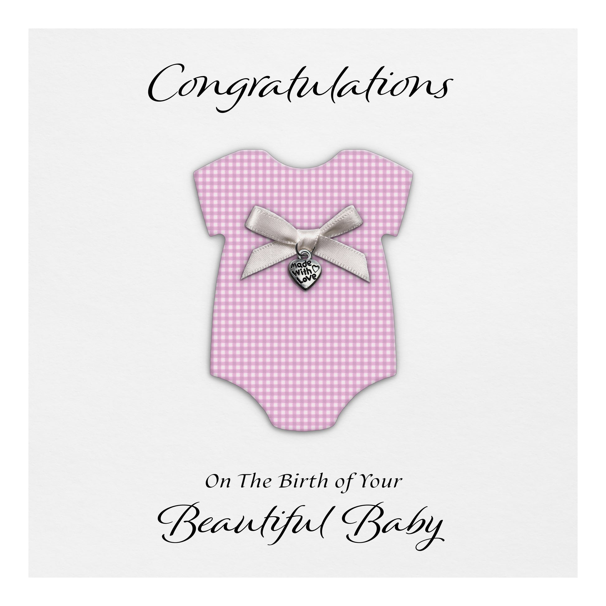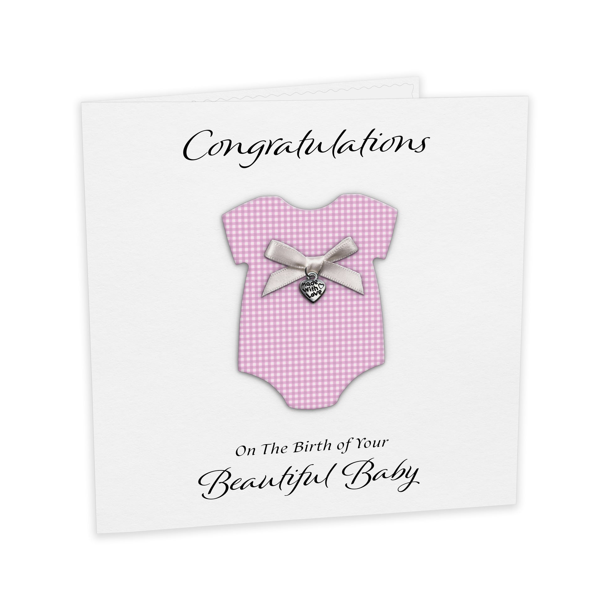 The design features a Raised Baby Grow Shape Cardstock Panel in carefully chosen colours and textures, finished with a Hand-tied bow and a High-Quality Metal Charm. Inside, a Blank Paper Insert adds to the premium feel and leaves space for a sentimental handwritten message.