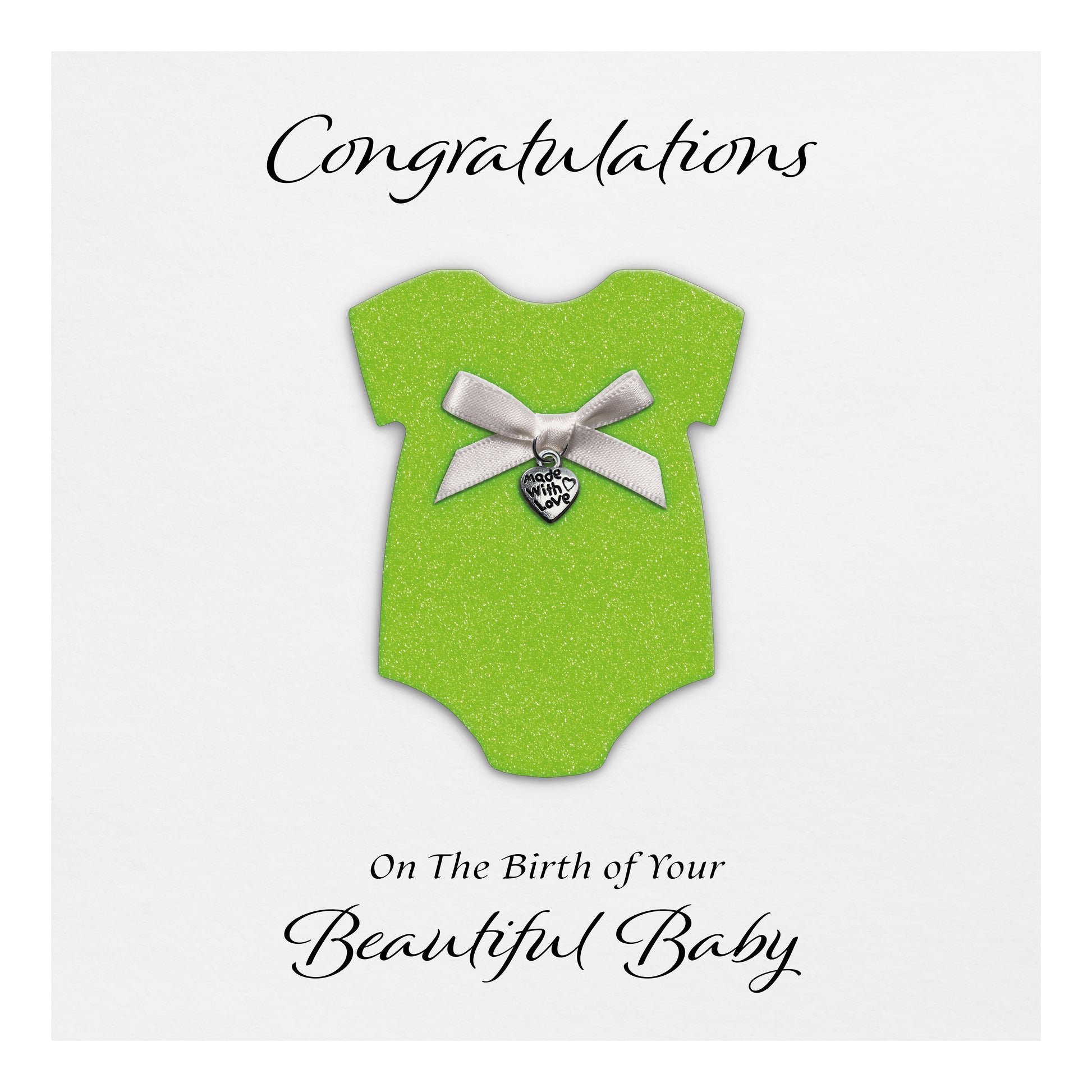 The design features a Raised Baby Grow Shape Cardstock Panel in carefully chosen colours and textures, finished with a Hand-tied bow and a High-Quality Metal Charm. Inside, a Blank Paper Insert adds to the premium feel and leaves space for a sentimental handwritten message.