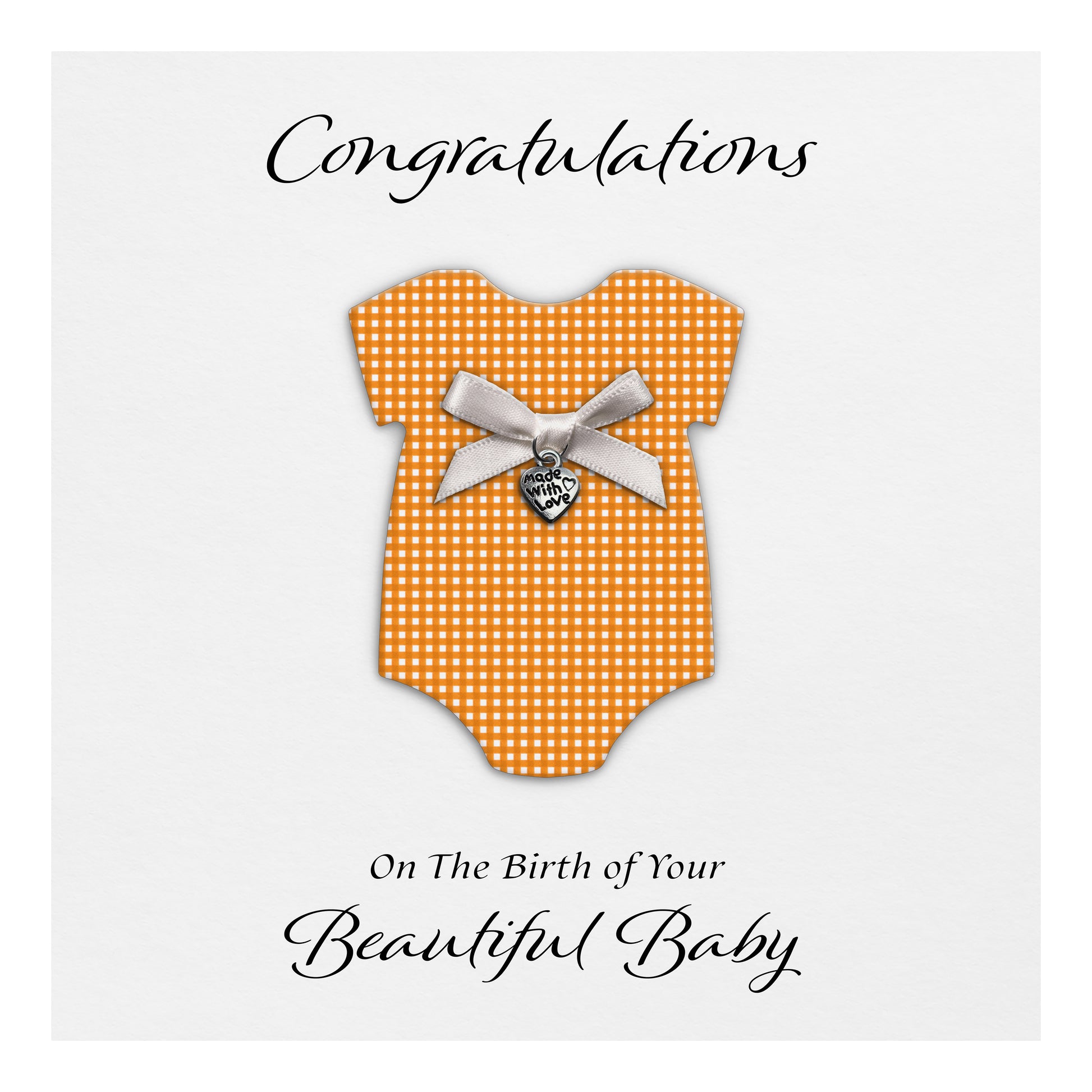 New Baby Card (Heart Charm & Bow) - White Cardstock / Orange Check