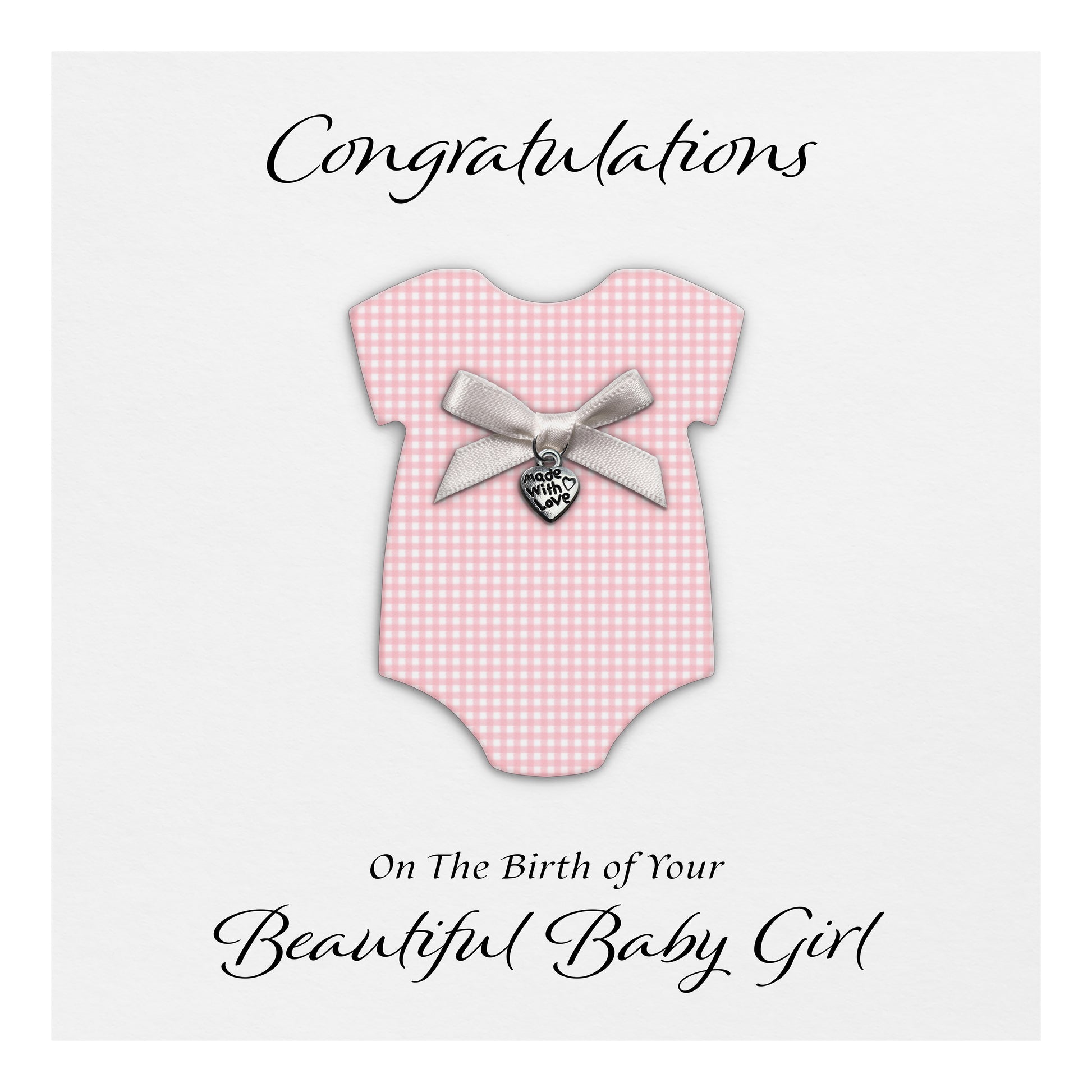 The design features a Raised Baby Grow Shape Cardstock Panel in carefully chosen colours and textures, finished with a Hand-tied bow and a High-Quality Metal Charm. Inside, a Blank Paper Insert adds to the premium feel and leaves space for a sentimental handwritten message.