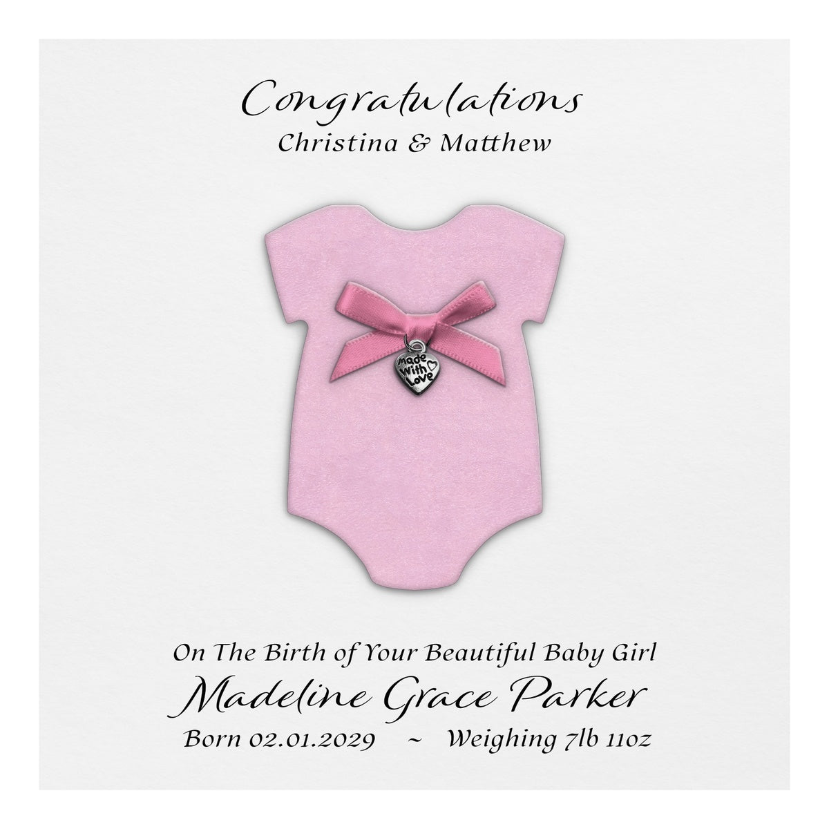 The design features a Raised Baby Grow Shape Cardstock Panel in a carefully chosen colour and texture, finished with a Hand-tied bow and a High-Quality Metal Charm. Your Personalised Text will be printed on the front design, an White Paper Insert then adds to the premium feel and leaves space for the option of either a Personalised Printed Message Inside or alternatively leave it Blank for a more sentimental handwritten message.