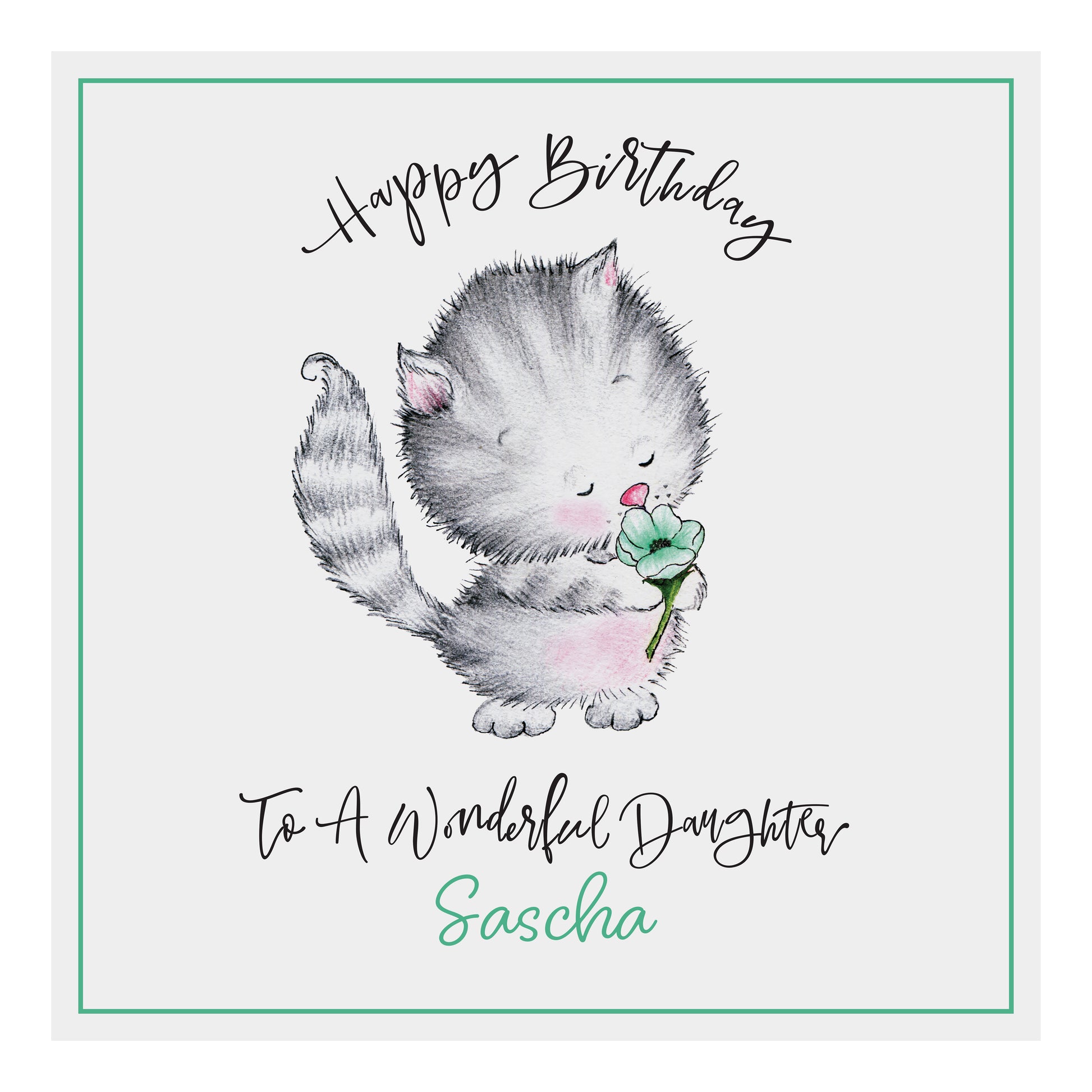 Personalised Birthday Card (Cute Cat With Flower) - Green