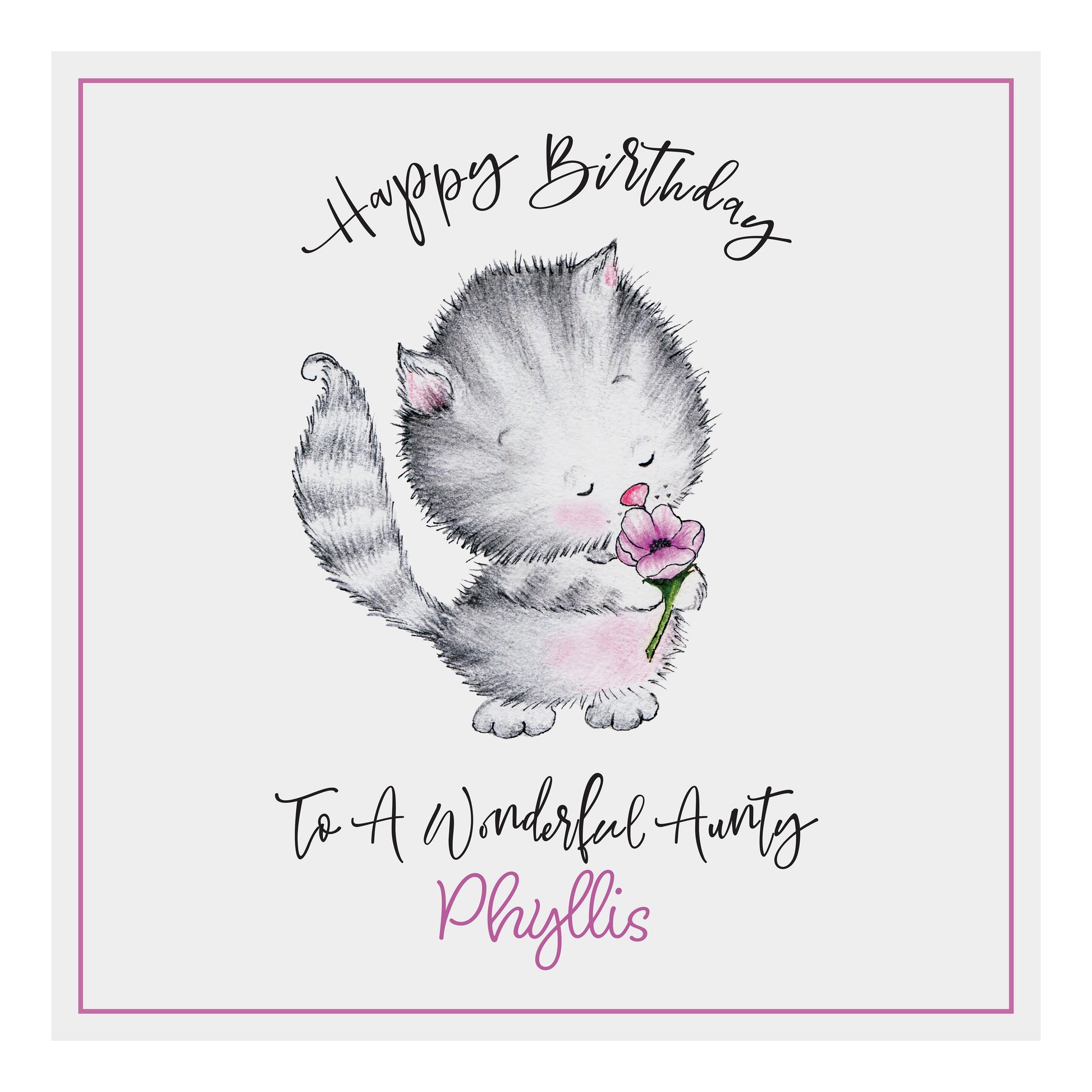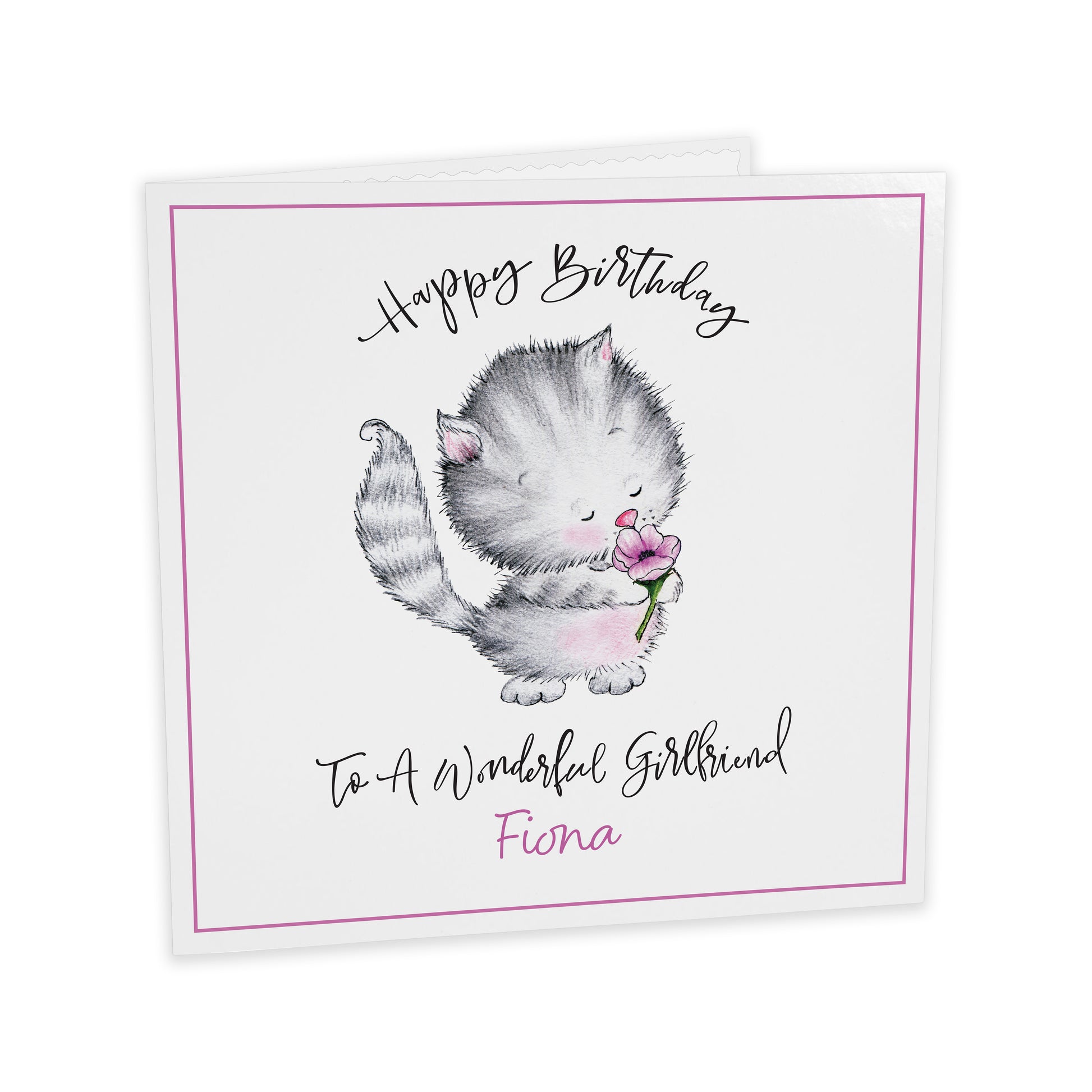Personalised Birthday Card (Cute Cat With Flower) - Pink
