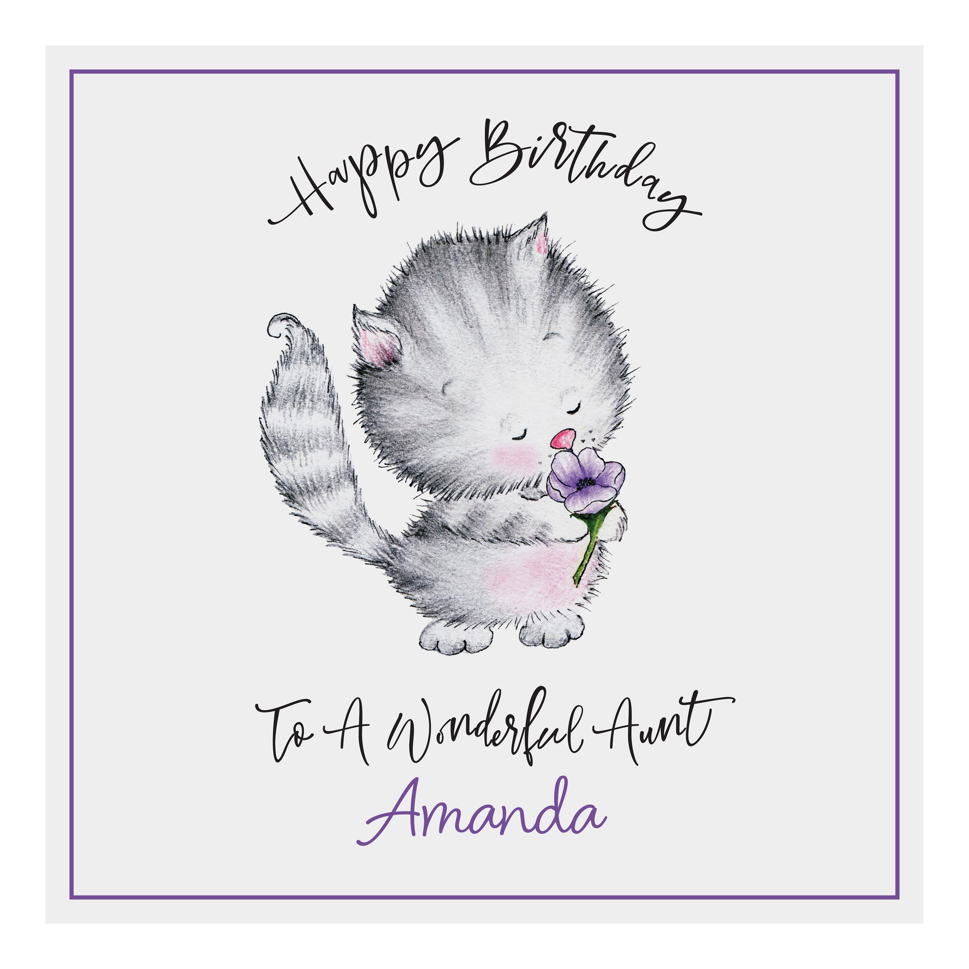 Personalised Birthday Card (Cute Cat With Flower) - Purple