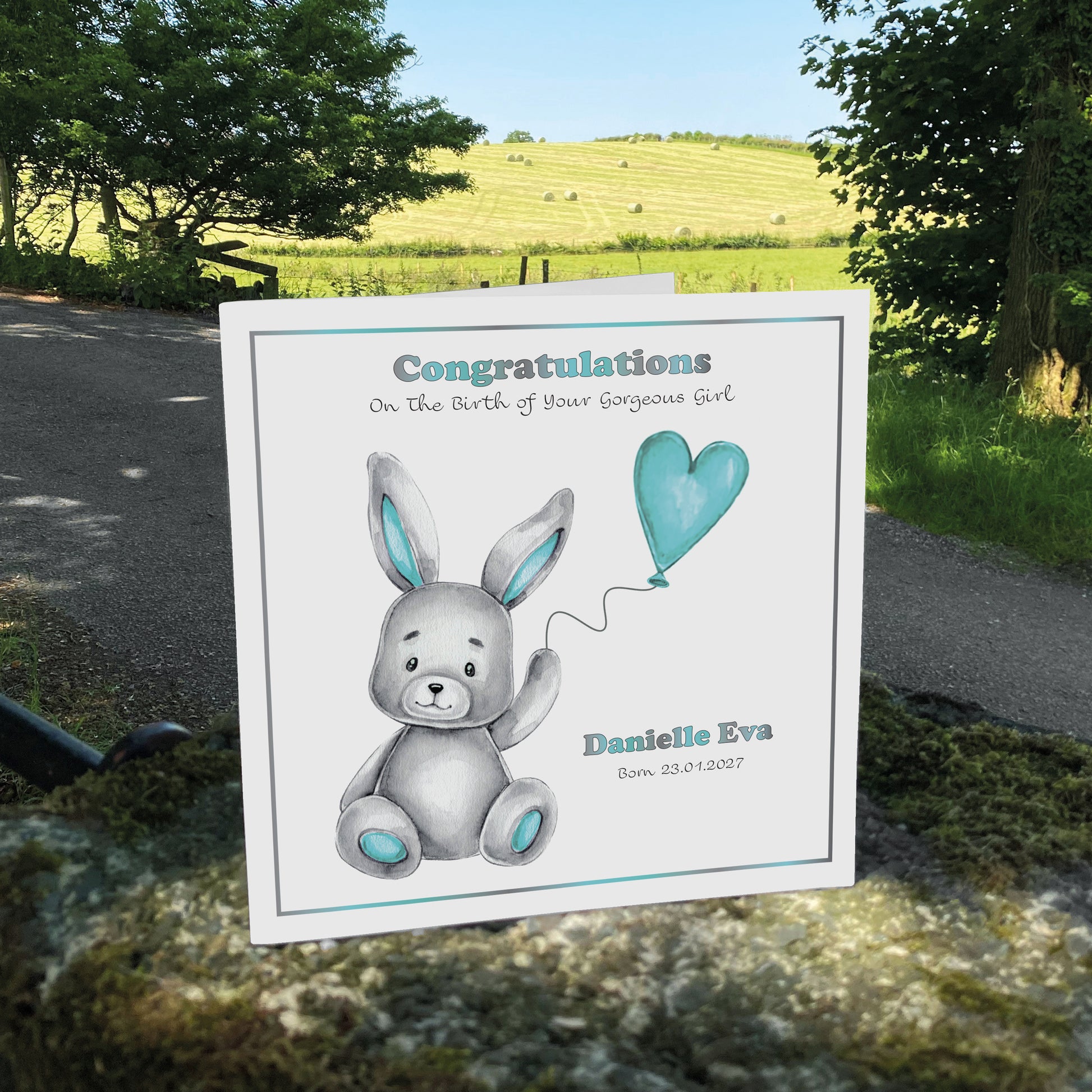 Personalised New Baby Card (Balloon Bunny) - Turquoise