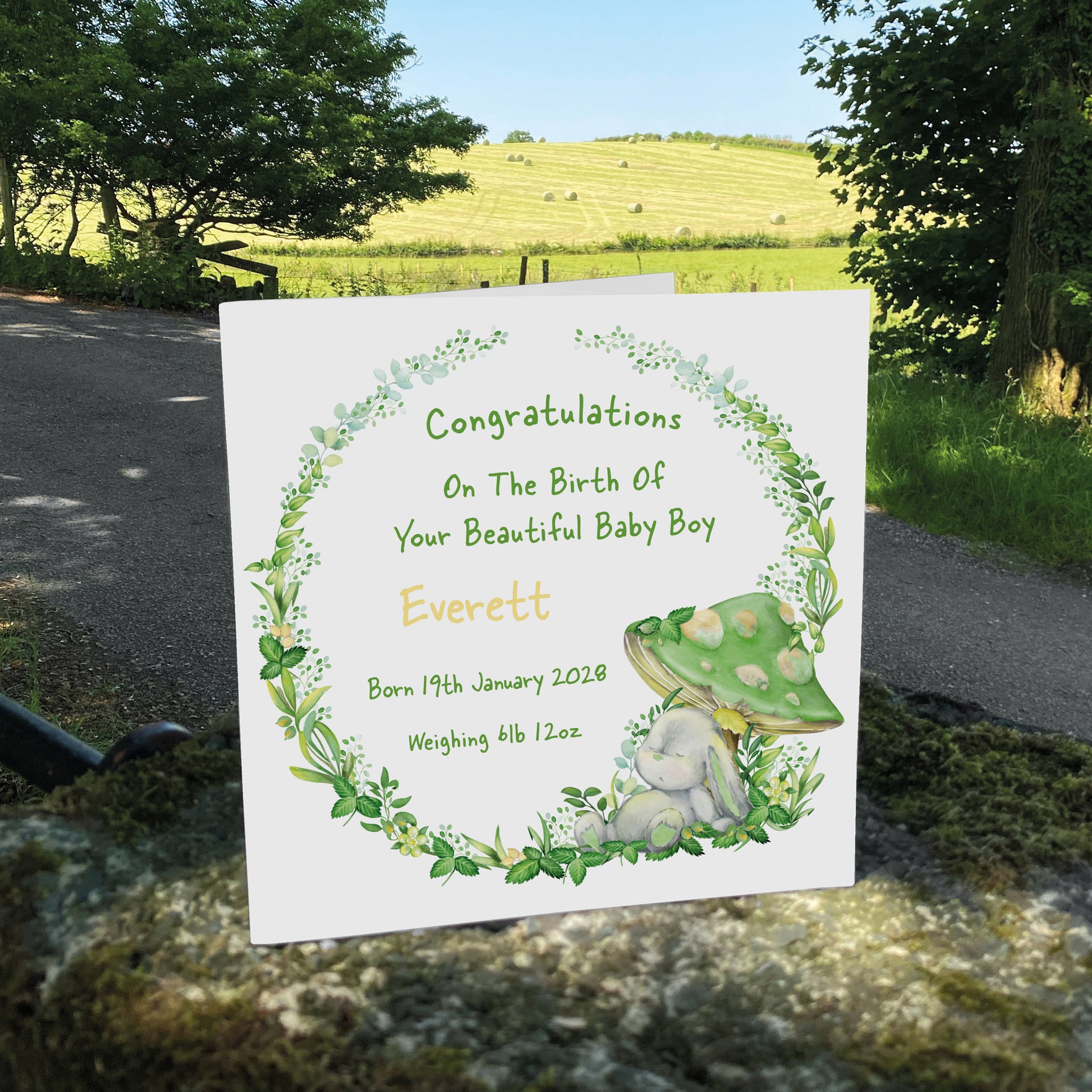 Personalised New Baby Card (Mushroom Bunny) - Green