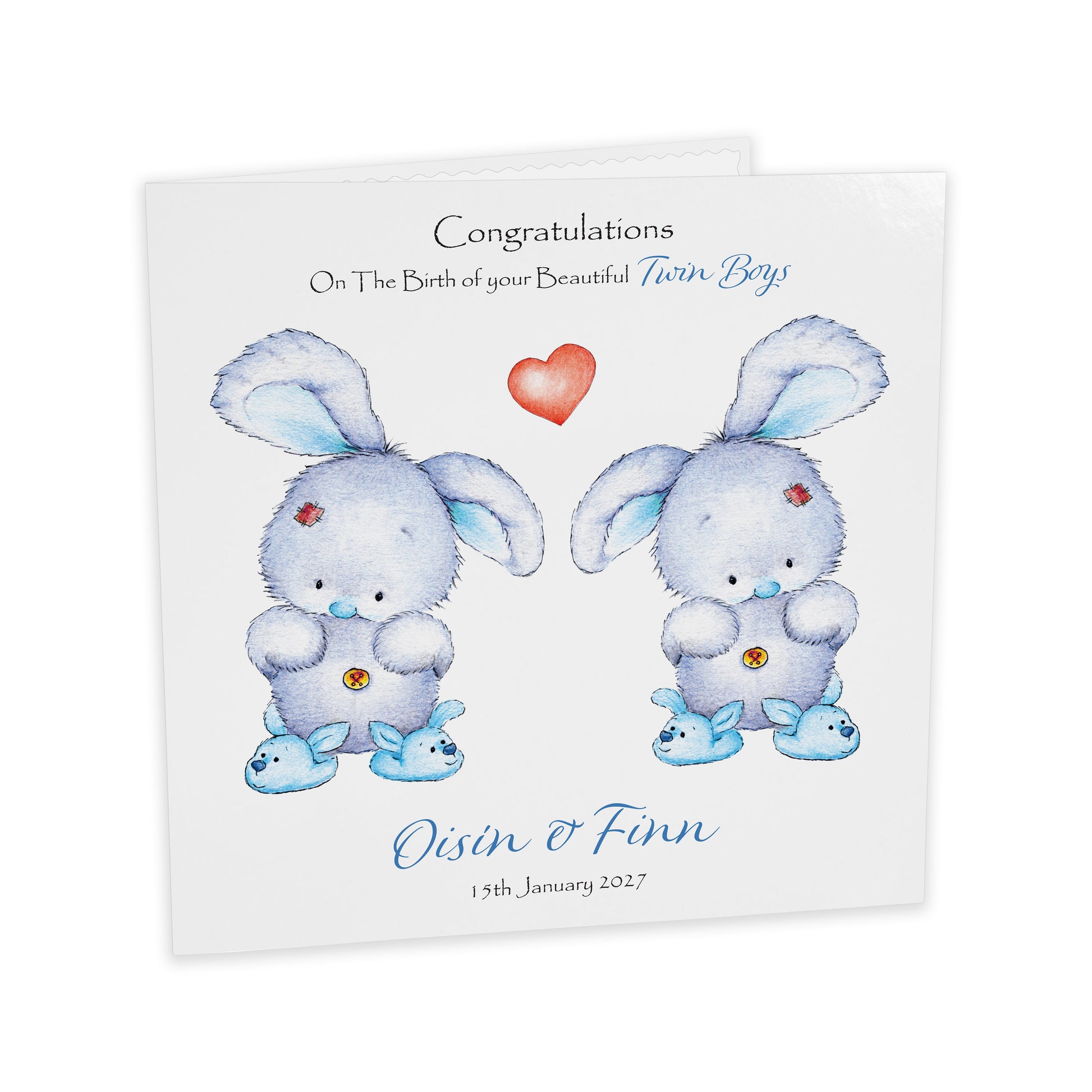 Personalised New Baby Card (Twin Bunnies) - Blue & Blue