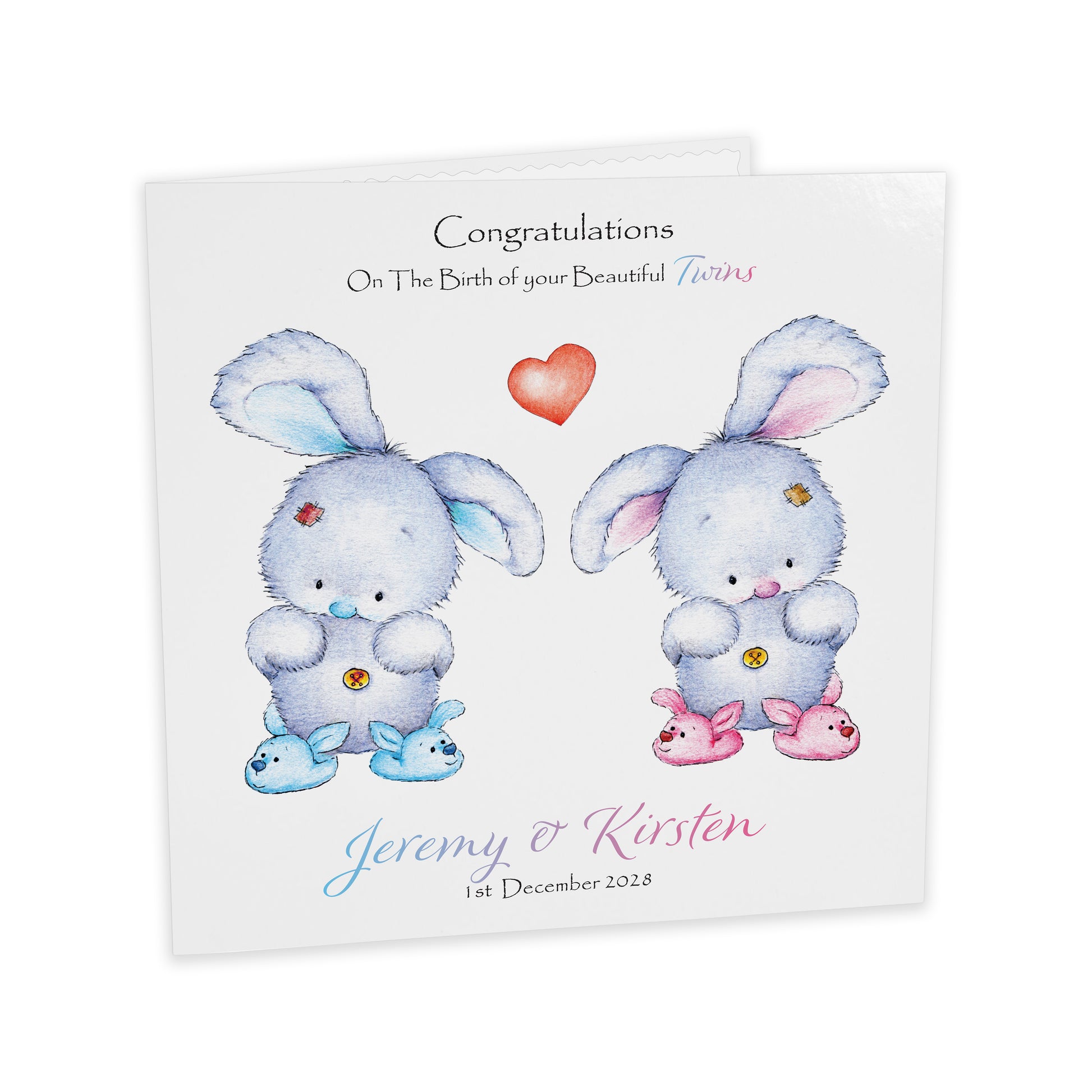 Personalised New Baby Card (Twin Bunnies) - Blue & Pink