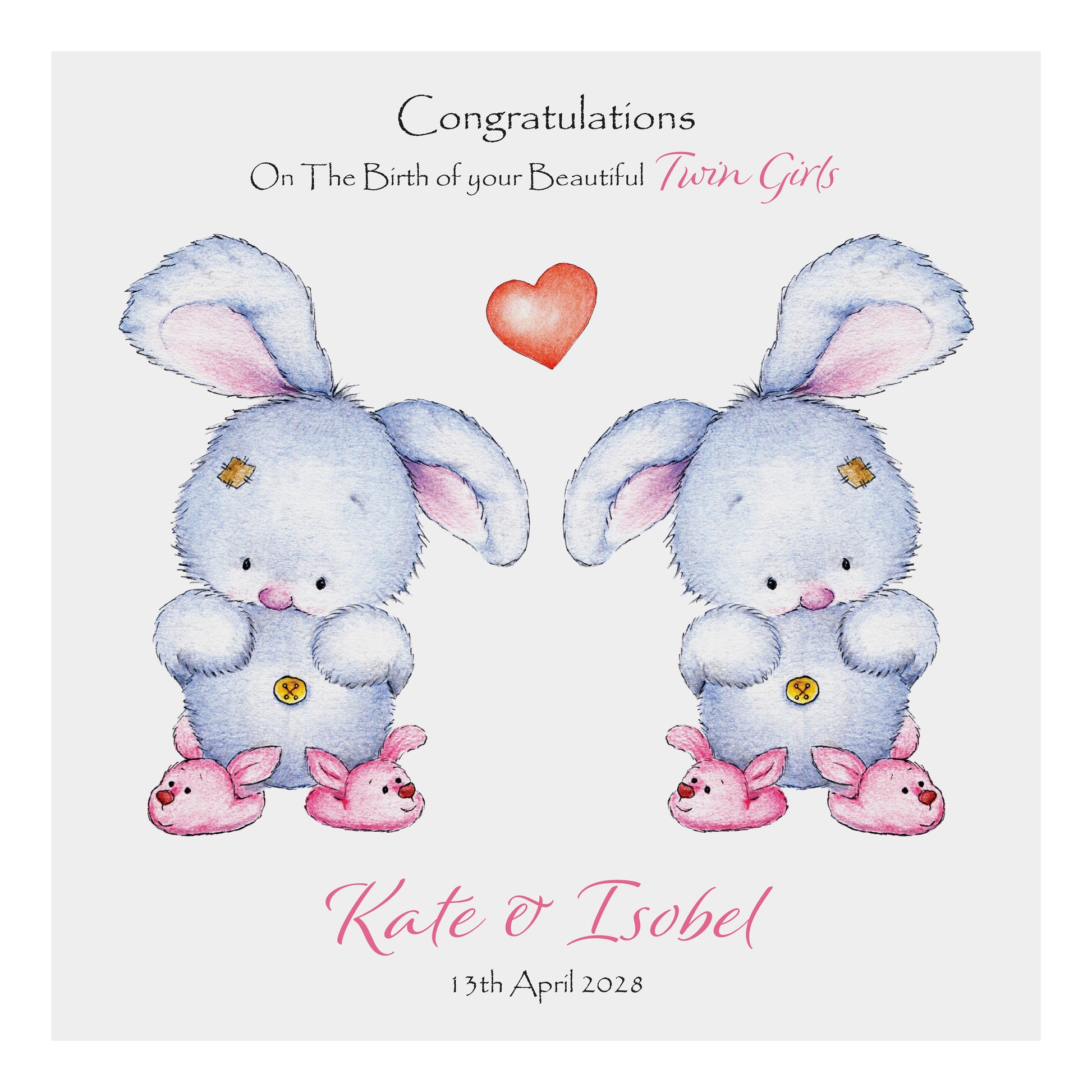 Personalised New Baby Card (Twin Bunnies) - Pink & Pink