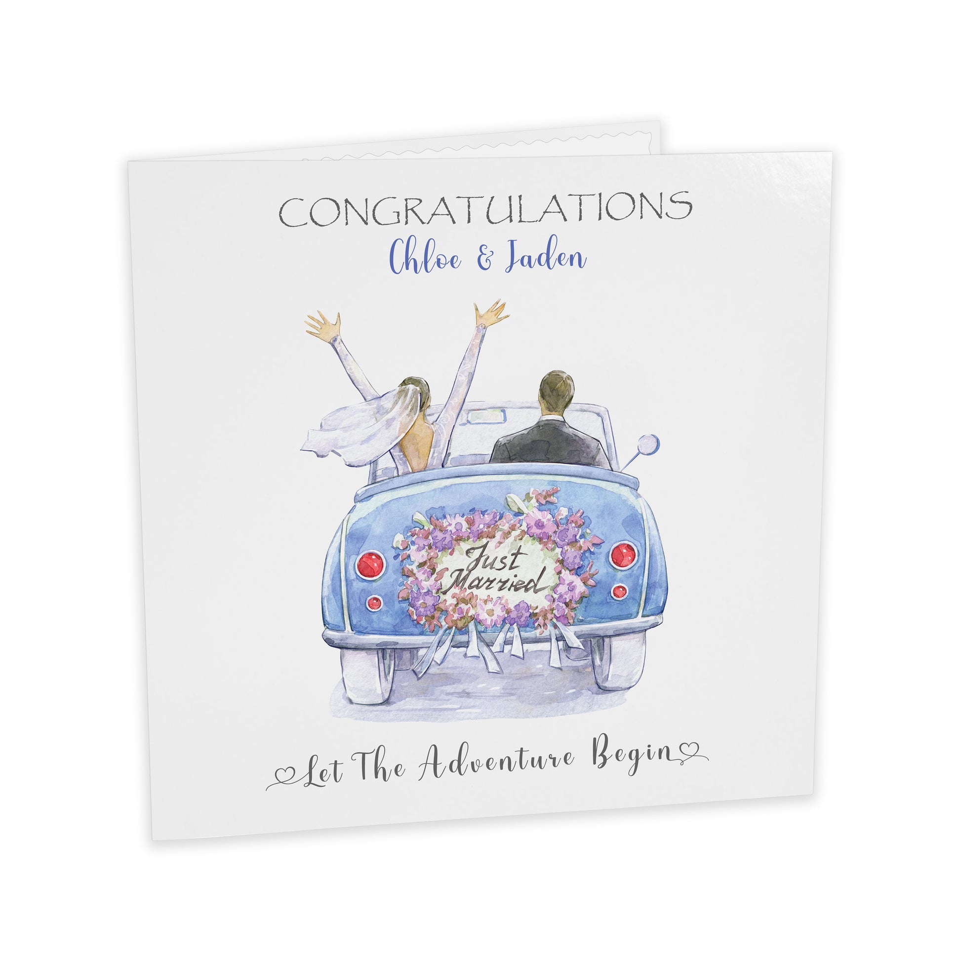 The design features a "Couple In Open Top Car With Just Married Reg" Design in carefully chosen colours. Your Personalised Text will be printed on the front design, a White Paper Insert then adds to the premium feel and leaves space for the option of either a Personalised Printed Message Inside or alternatively leave it Blank for a sentimental handwritten message.