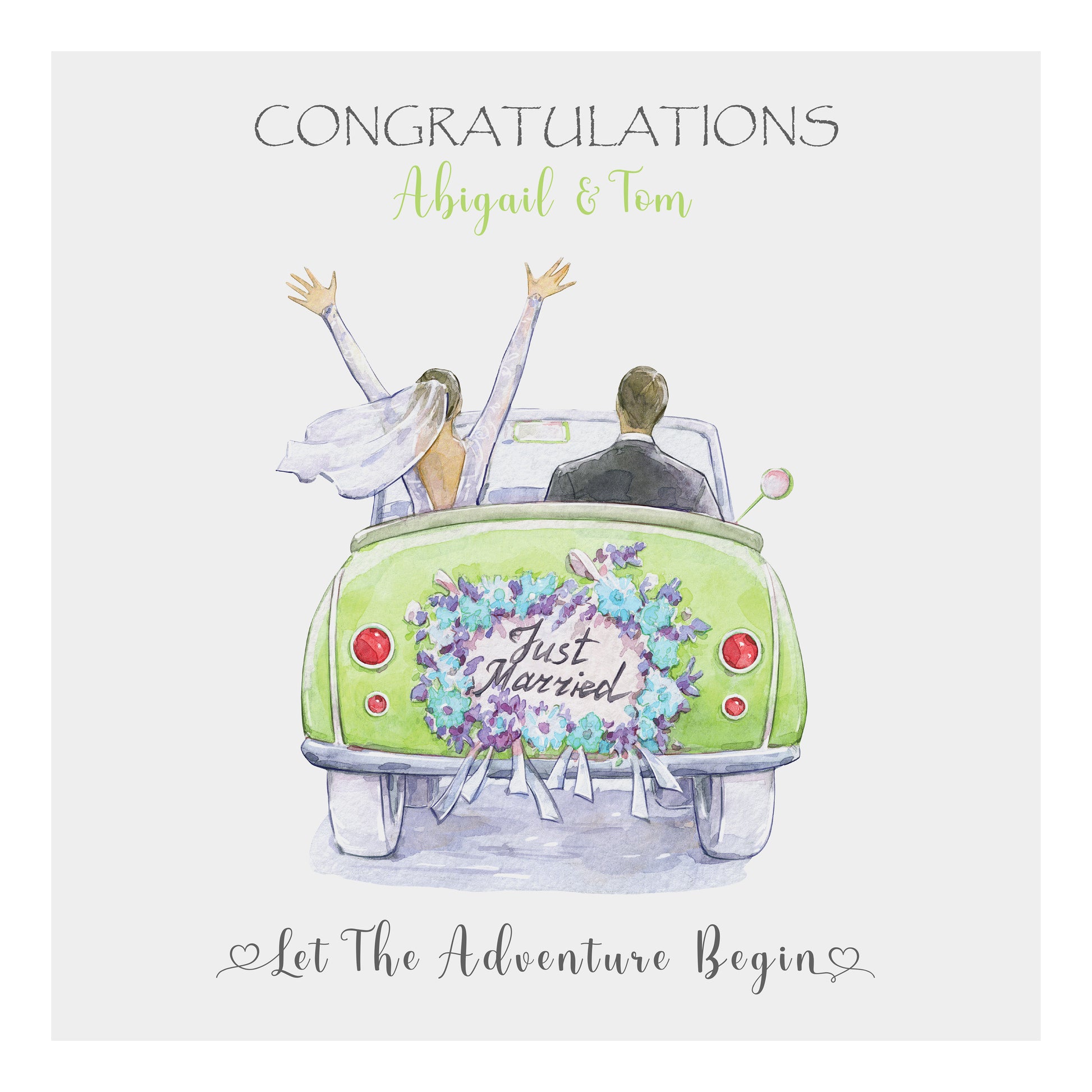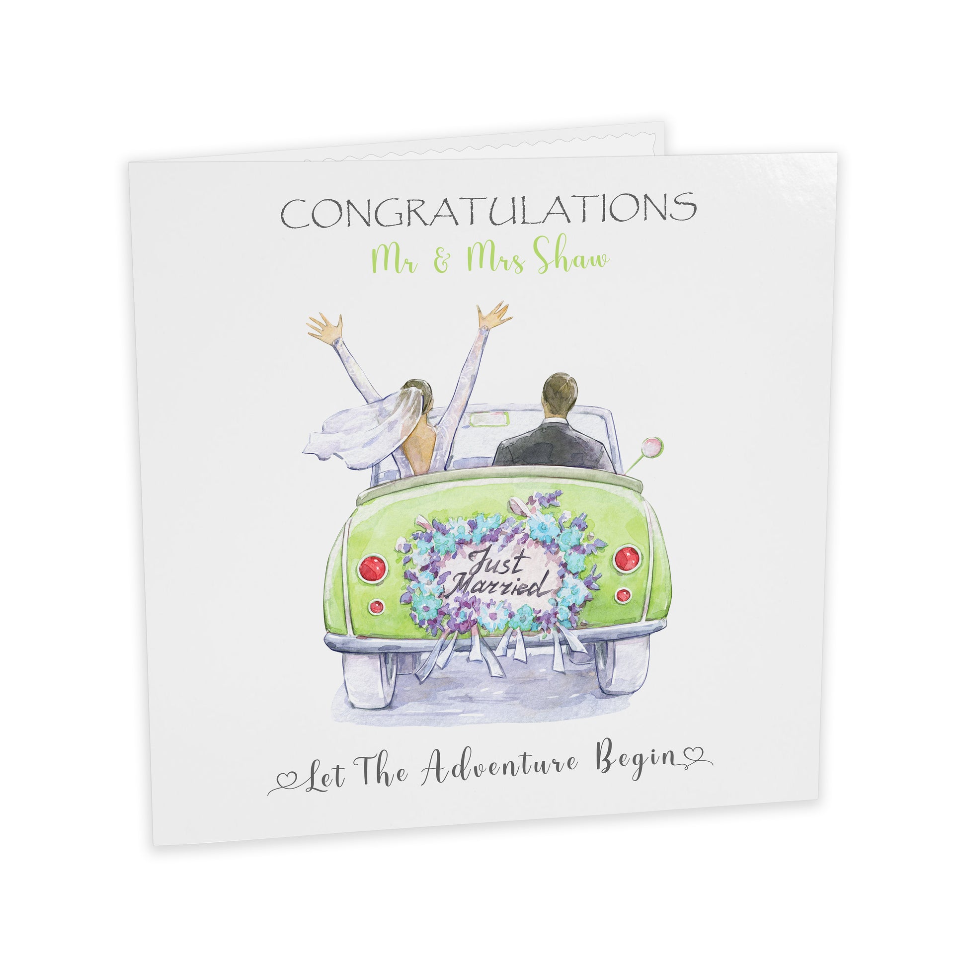 The design features a "Couple In Open Top Car With Just Married Reg" Design in carefully chosen colours. Your Personalised Text will be printed on the front design, a White Paper Insert then adds to the premium feel and leaves space for the option of either a Personalised Printed Message Inside or alternatively leave it Blank for a sentimental handwritten message.