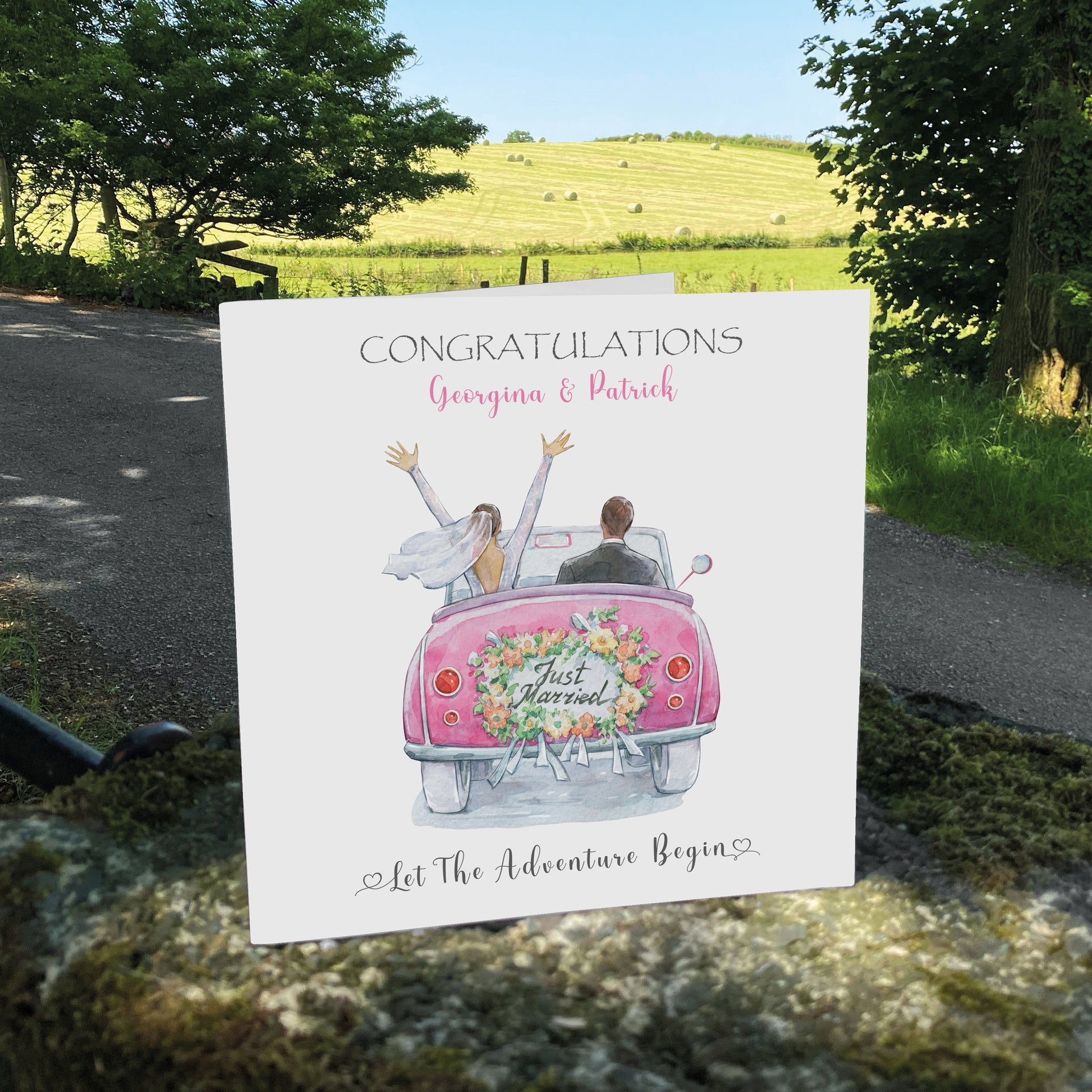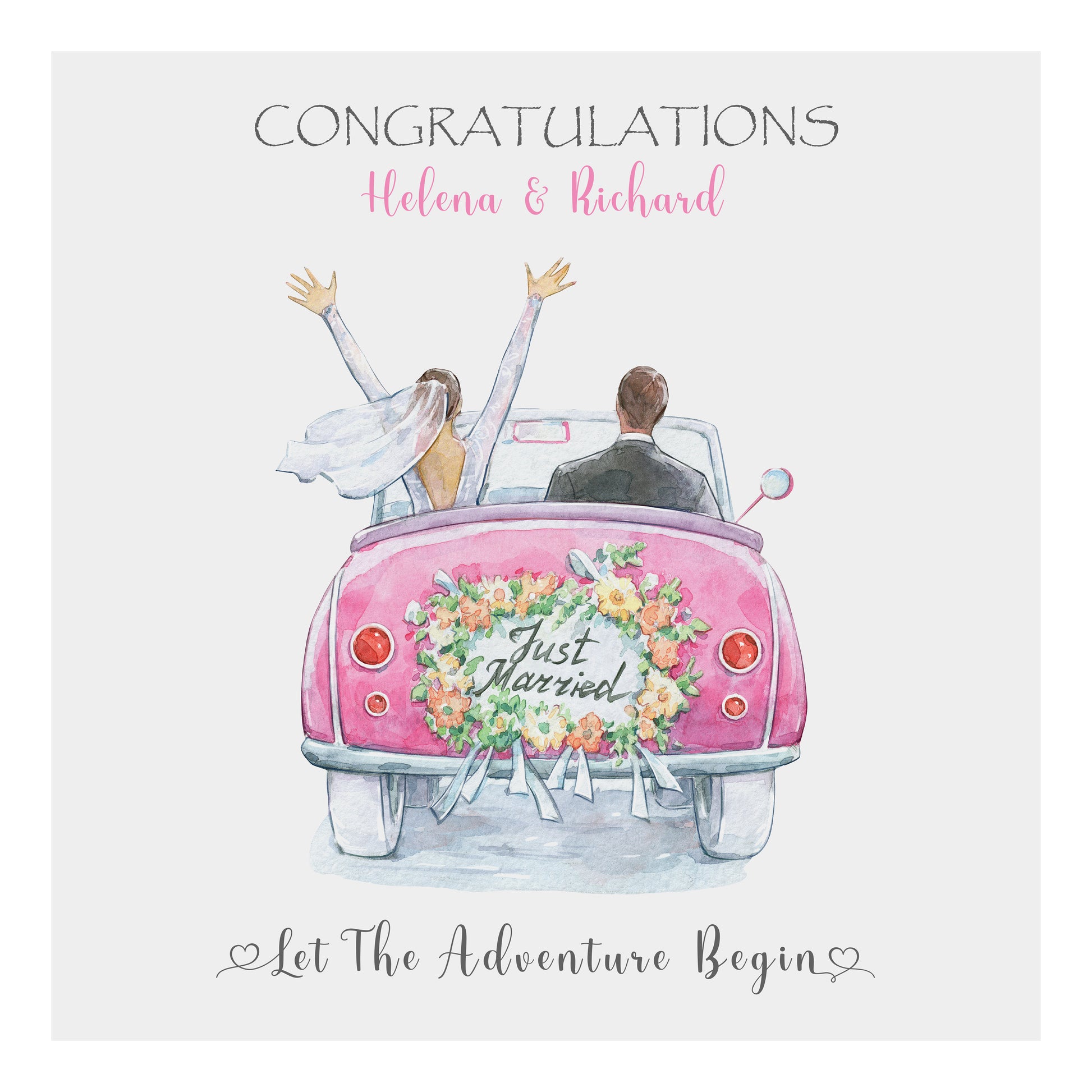 The design features a "Couple In Open Top Car With Just Married Reg" Design in carefully chosen colours. Your Personalised Text will be printed on the front design, a White Paper Insert then adds to the premium feel and leaves space for the option of either a Personalised Printed Message Inside or alternatively leave it Blank for a sentimental handwritten message.