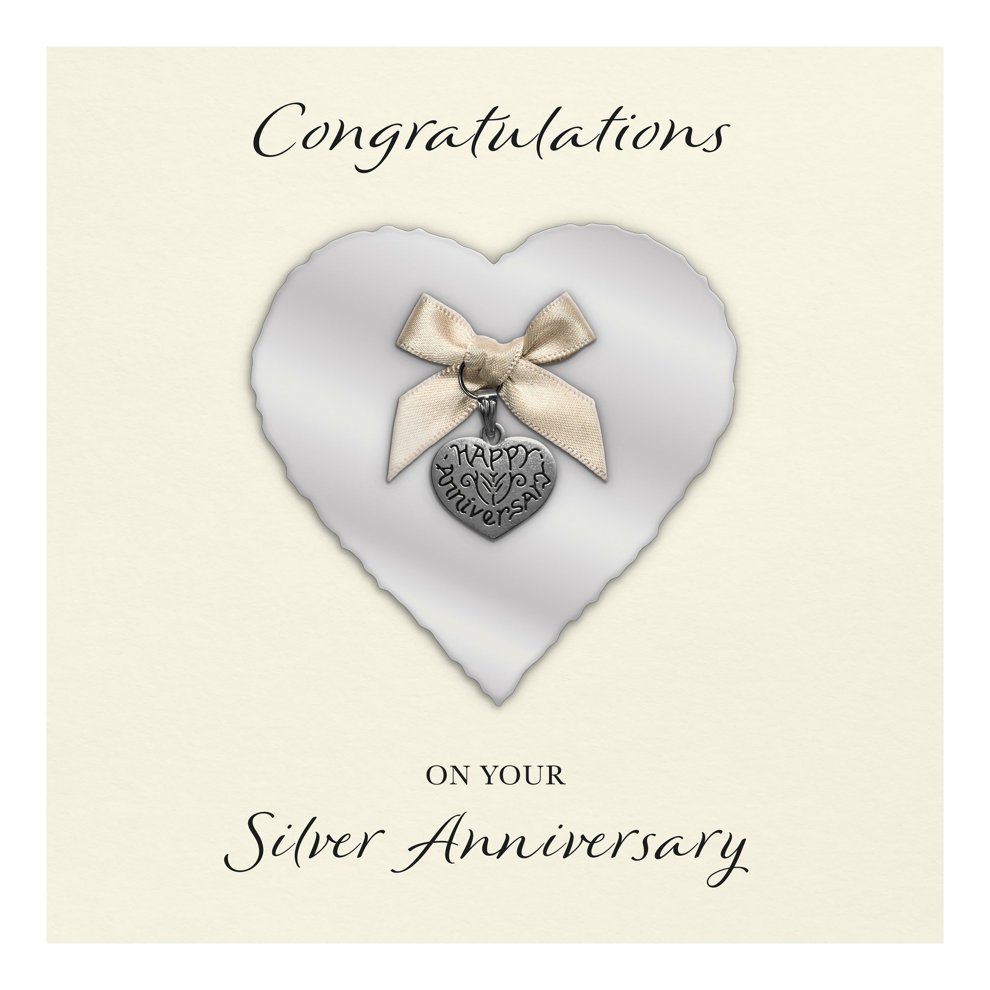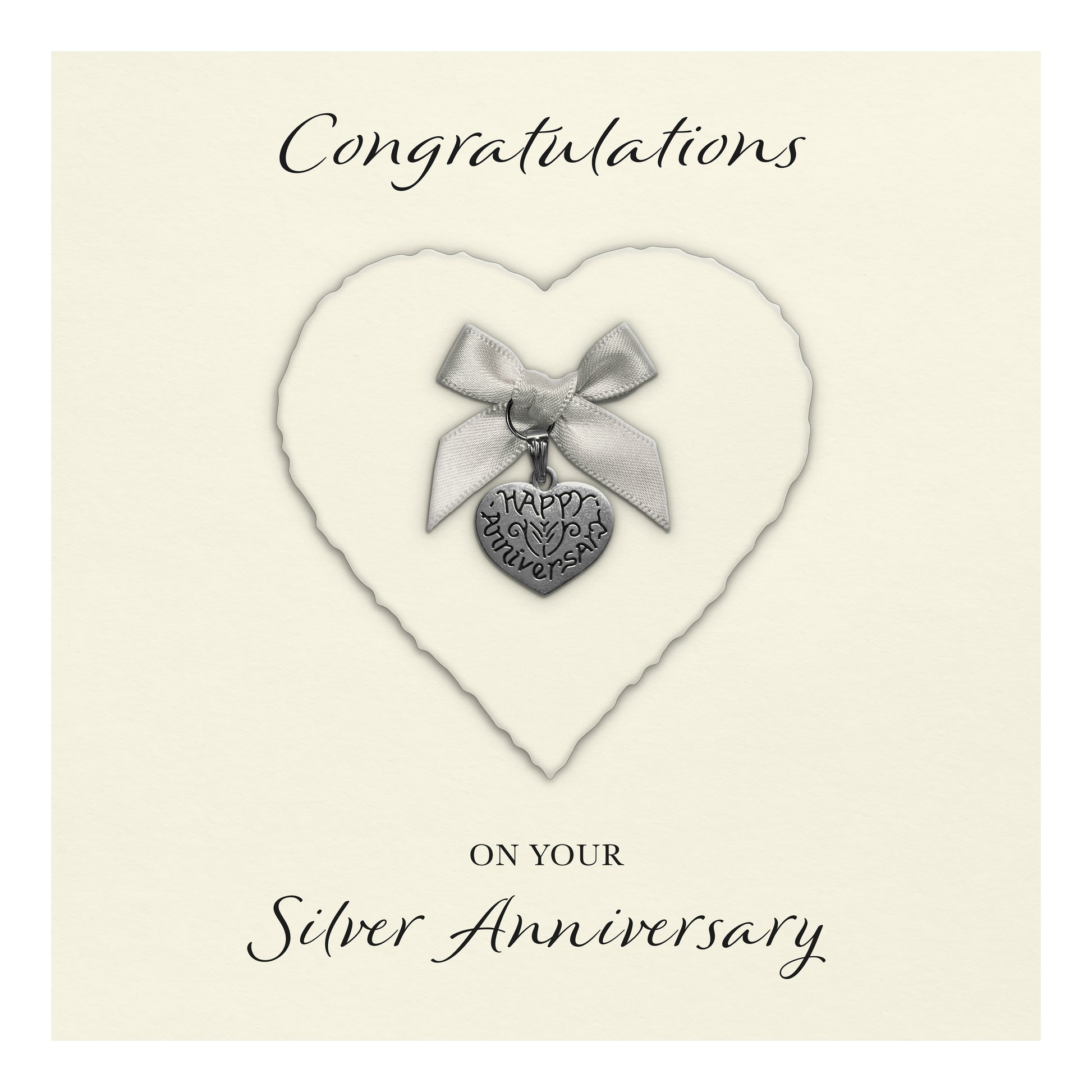 Silver 25th Anniversary Card (Heart Charm & Bow) - Ivory Cardstock