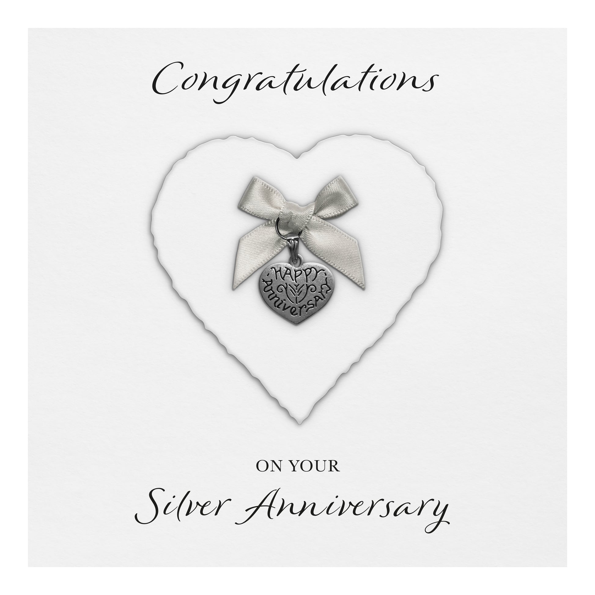 Silver 25th Anniversary Card (Heart Charm & Bow) - White Cardstock
