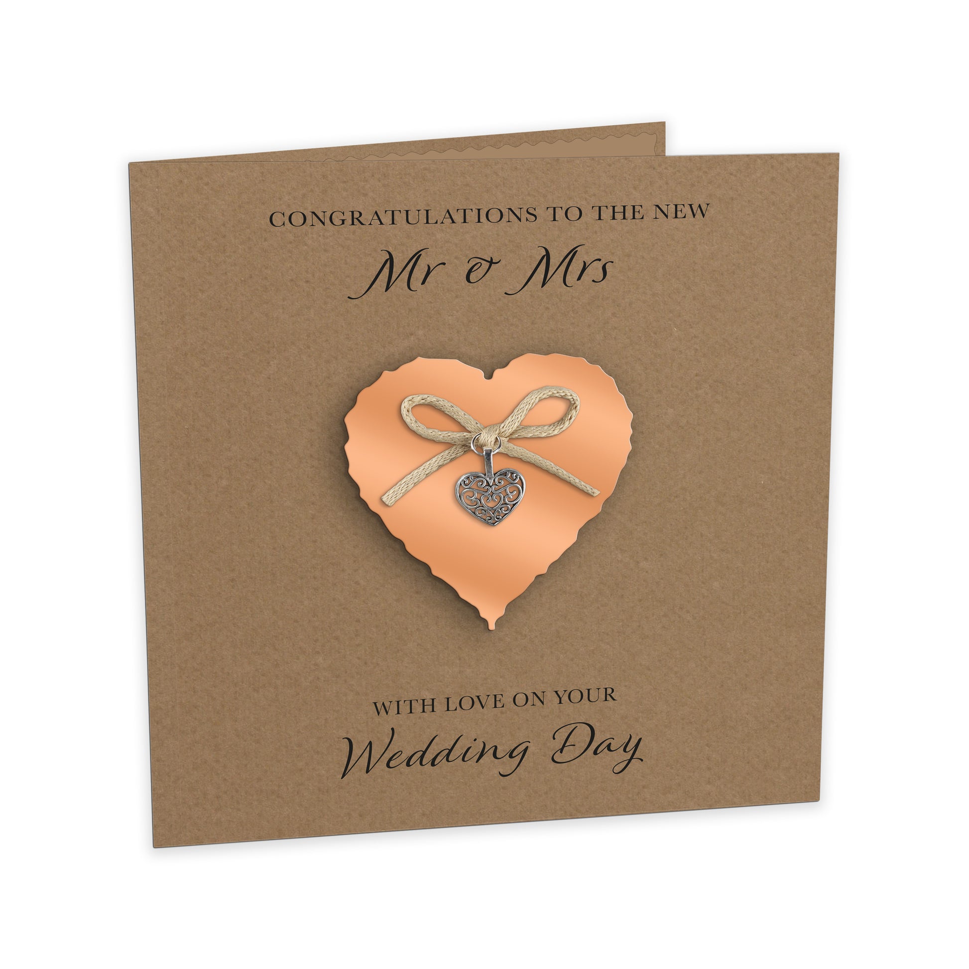 Wedding Day Card (Heart Charm & Bow) - Coral Heart / Kraft Cardstock