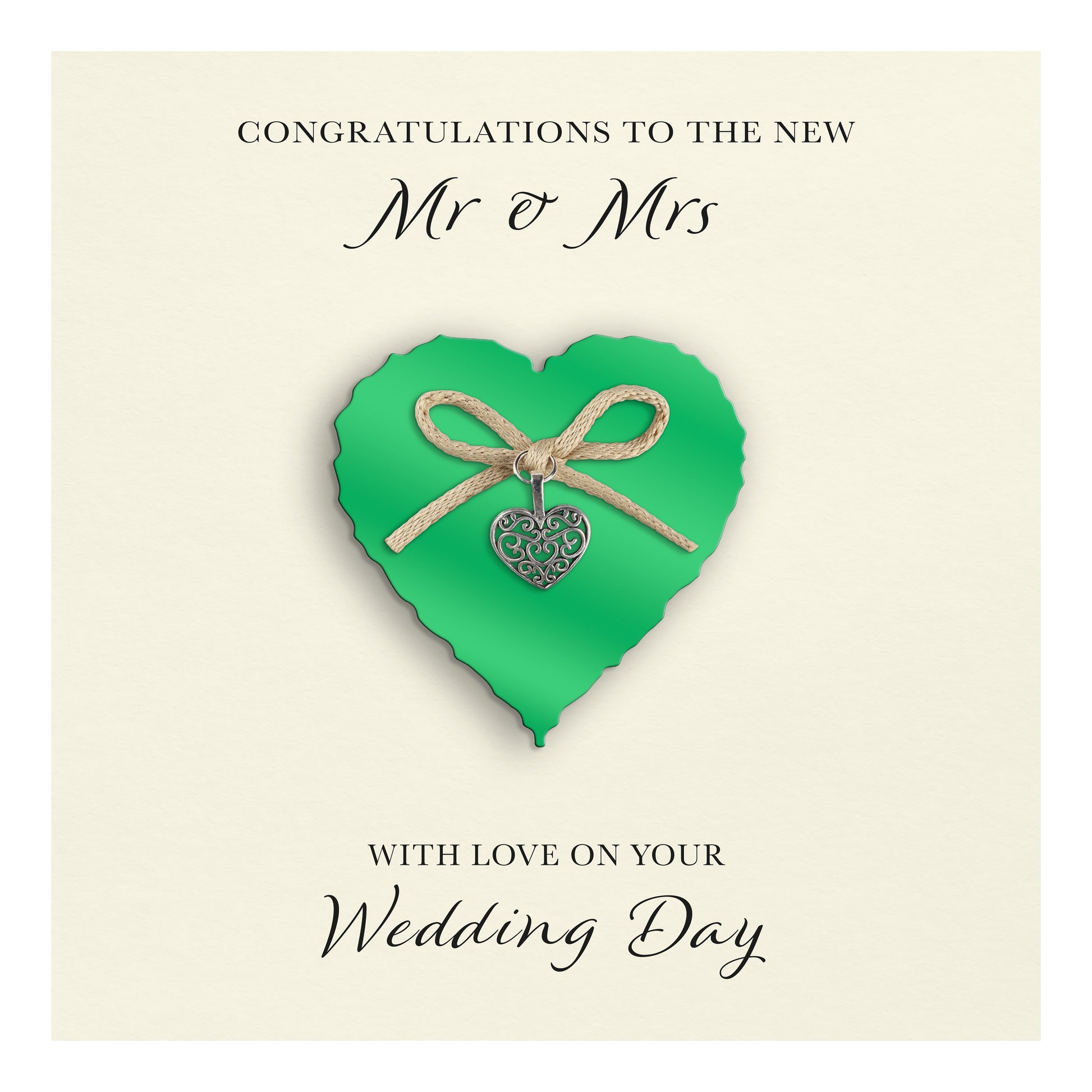 Wedding Day Card (Heart Charm & Bow) - Emerald Heart / Ivory Cardstock