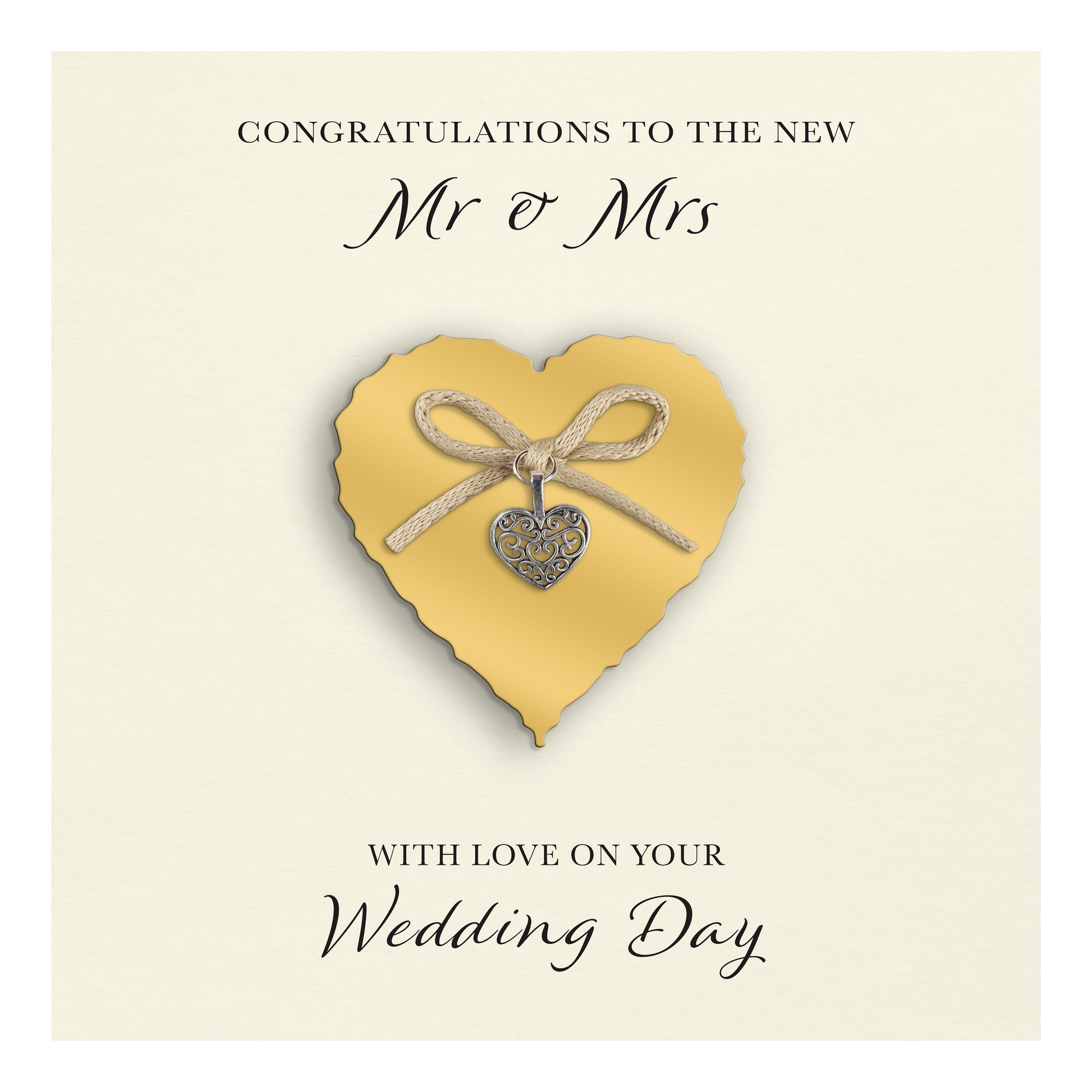 Wedding Day Card (Heart Charm & Bow) - Gold Heart / Ivory Cardstock