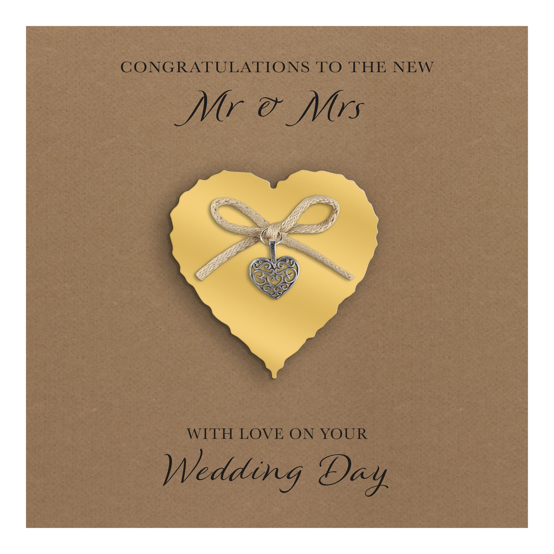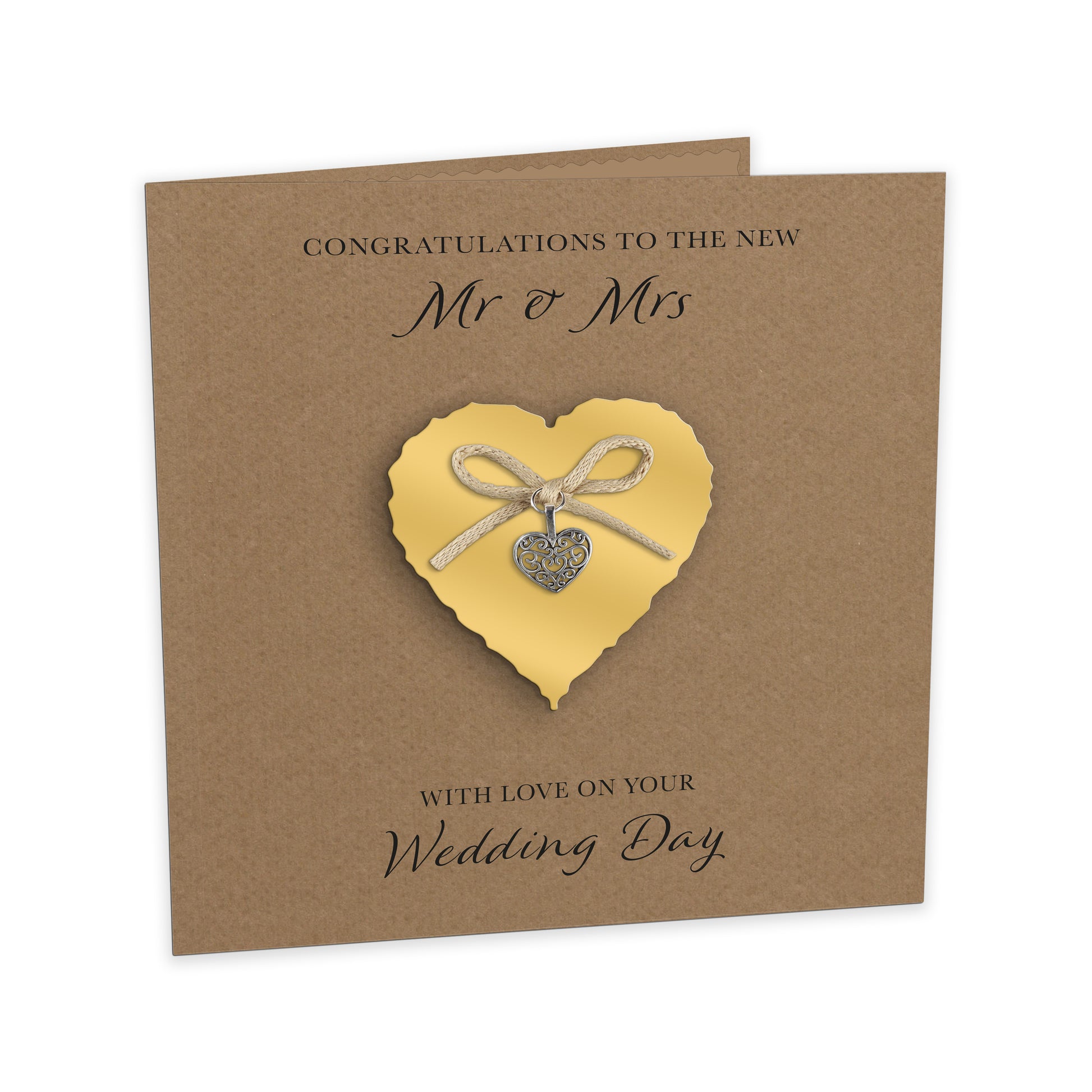 Wedding Day Card (Heart Charm & Bow) - Gold Heart / Kraft Cardstock