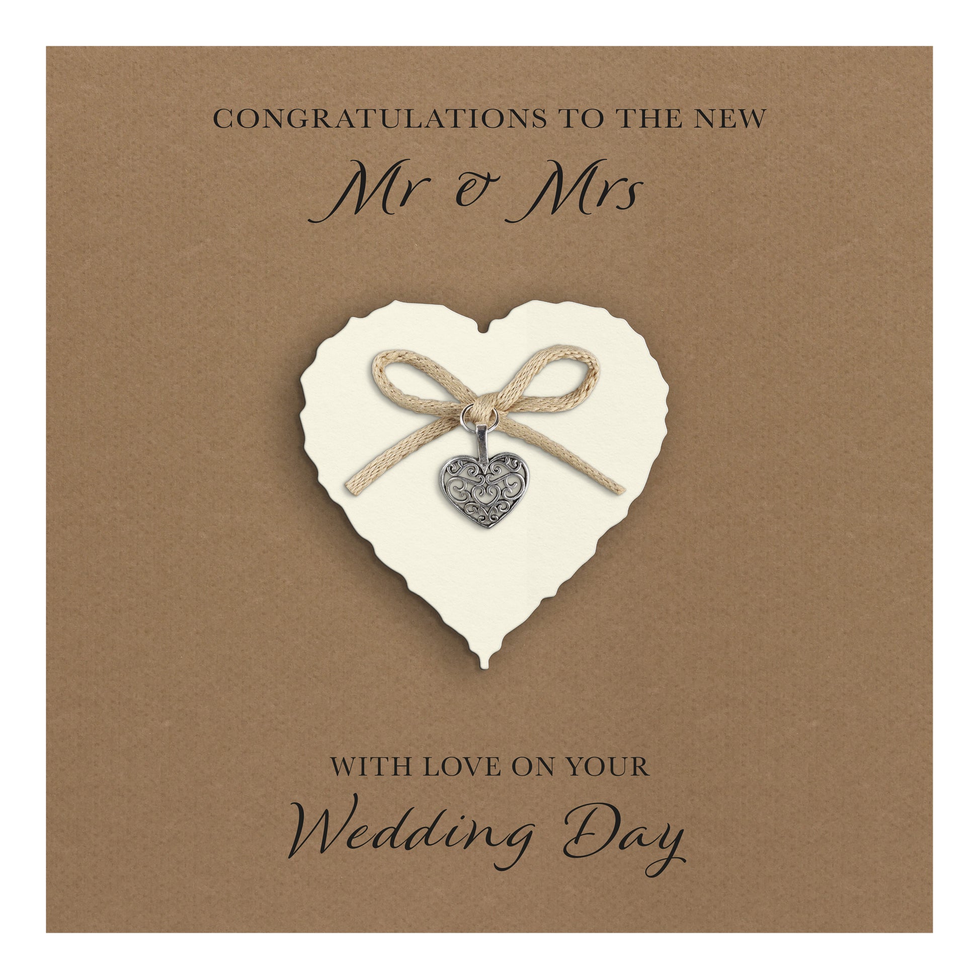 Wedding Day Card (Heart Charm & Bow) - Ivory Heart / Kraft Cardstock