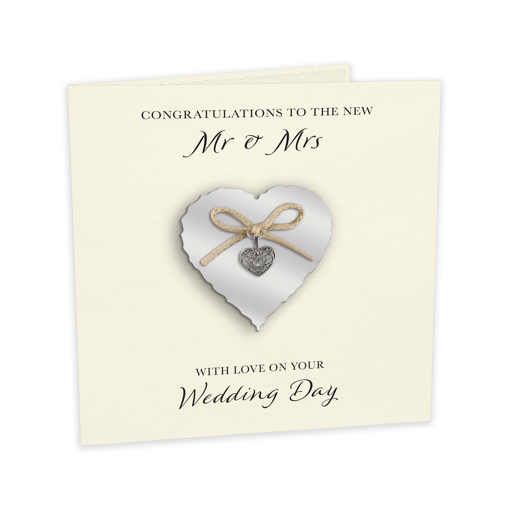 Wedding Day Card (Heart Charm & Bow) - Silver Heart / Ivory Cardstock