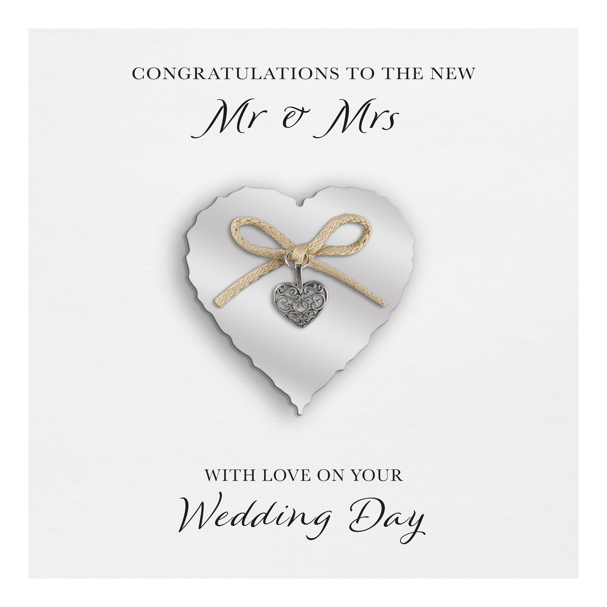 Wedding Day Card (Heart Charm & Bow) - Silver Heart / White Cardstock