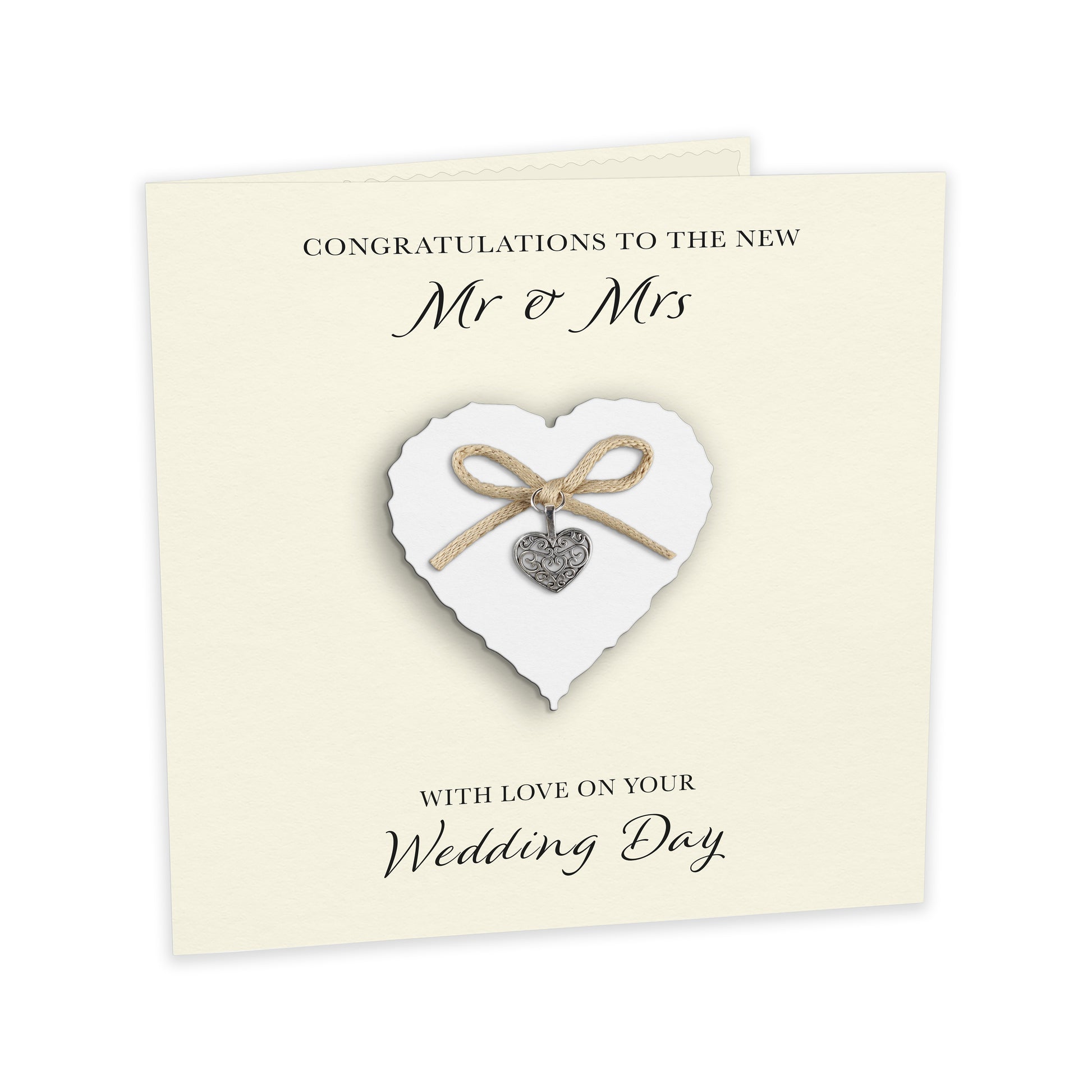 Wedding Day Card (Heart Charm & Bow) - White Heart / Ivory Cardstock